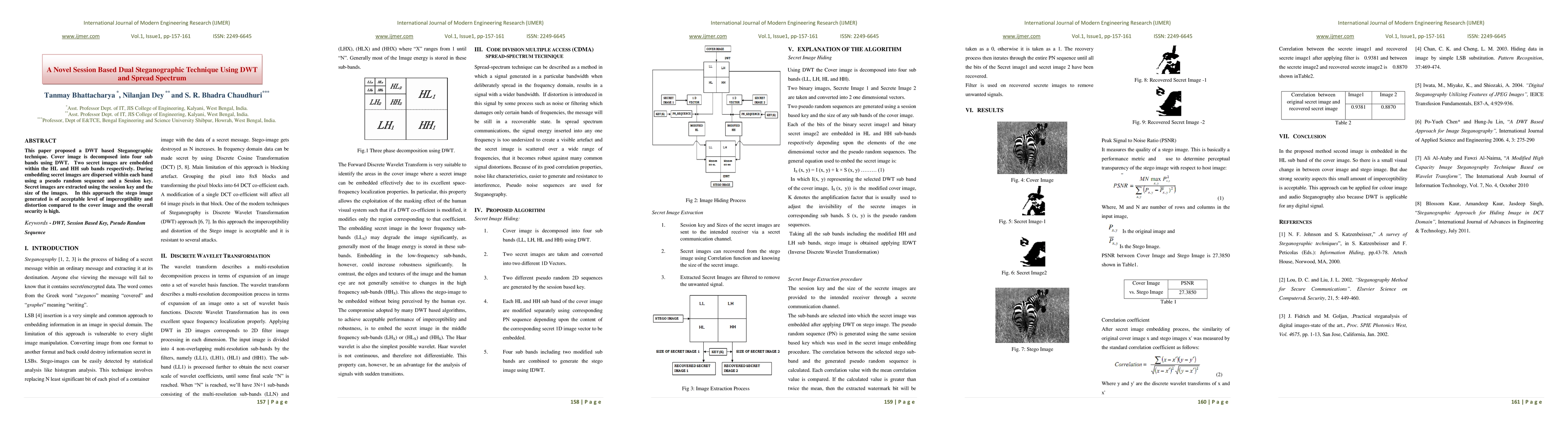 This paper introduces a novel dual steganographic technique using DWT and spread spectrum, embedding two secret images in sub-bands of a decomposed cover image, ensuring high security and low perceptibility. The method employs a pseudo random sequence and a session key for dispersing and extracting the secret images.
