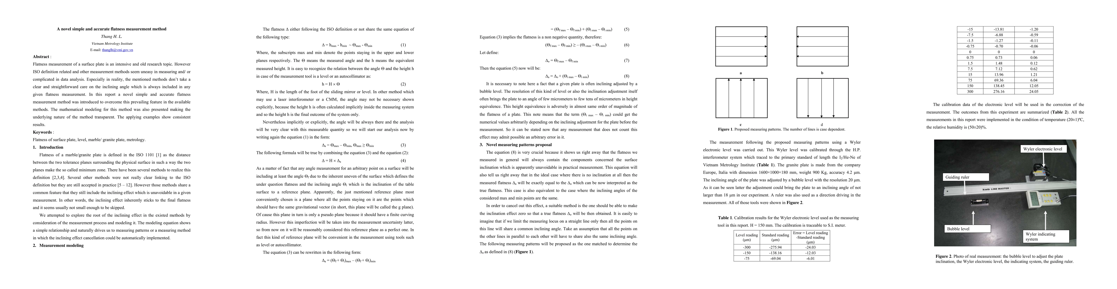 Flatness measurement of a surface plate is an intensive and old research topic. However ISO definition related and other measurement methods seem uneasy in measuring and/ or complicated in data analysis. Especially in reality, the mentioned methods don't take a clear and straightforward care on the inclining angle which is always included in any given flatness measurement. In this report a novel simple and accurate flatness measurement method was introduced to overcome this prevailing feature in the available methods. The mathematical modeling for this method was also presented making the underlying nature of the method transparent. The applying examples show consistent results.
