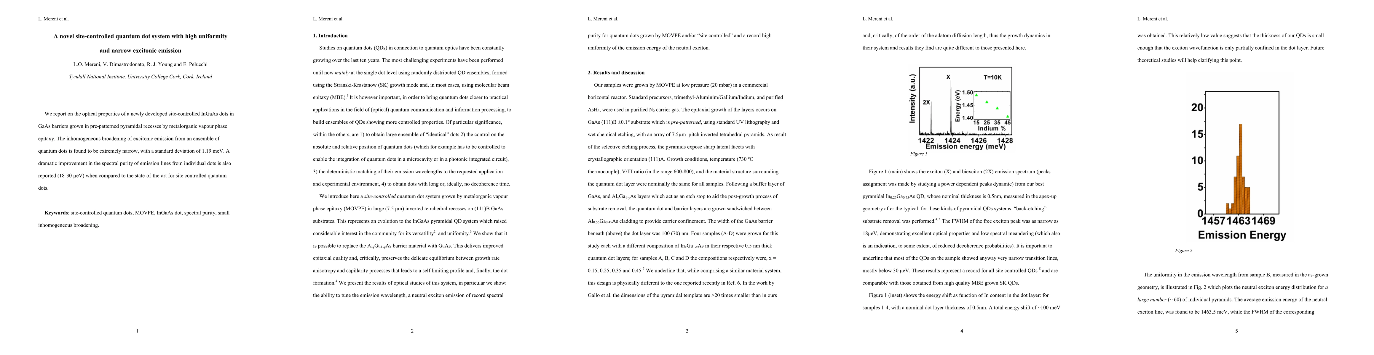 We report on the optical properties of a newly developed site-controlled InGaAs Dots in GaAs barriers grown in pre-patterned pyramidal recesses by metalorganic vapour phase epitaxy. The inhomogeneous broadening of excitonic emission from an ensemble of quantum dots is found to be extremely narrow, with a standard deviation of 1.19 meV. A dramatic improvement in the spectral purity of emission lines from individual dots is also reported (18-30 ueV) when compared to the state-of-the-art for site controlled quantum dots.
