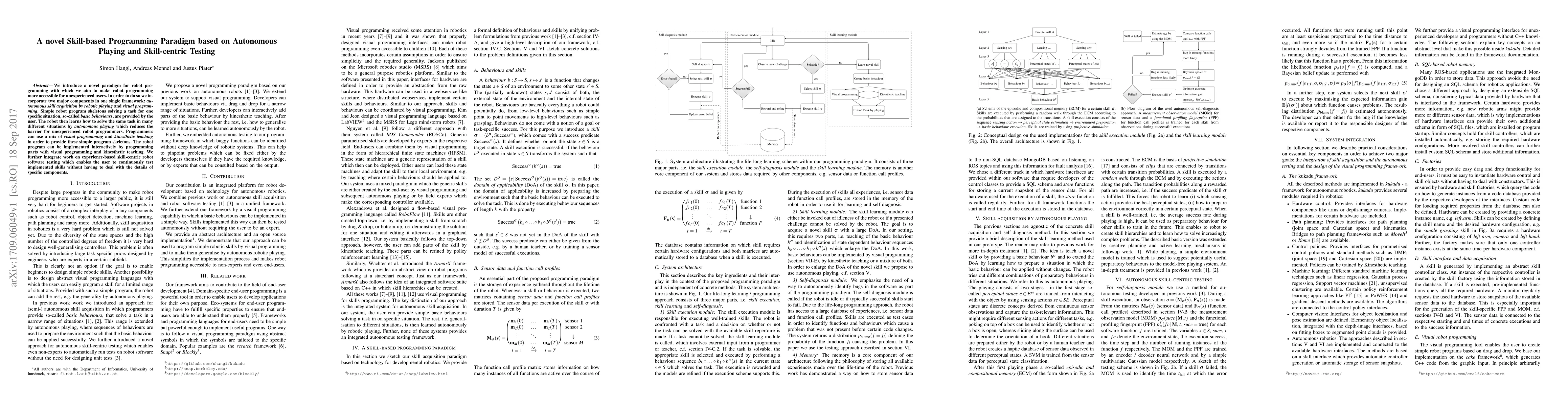 We introduce a novel paradigm for robot pro- gramming with which we aim to make robot programming more accessible for unexperienced users. In order to do so we incorporate two major components in one single framework: autonomous skill acquisition by robotic playing and visual programming. Simple robot program skeletons solving a task for one specific situation, so-called basic behaviours, are provided by the user. The robot then learns how to solve the same task in many different situations by autonomous playing which reduces the barrier for unexperienced robot programmers. Programmers can use a mix of visual programming and kinesthetic teaching in order to provide these simple program skeletons. The robot program can be implemented interactively by programming parts with visual programming and kinesthetic teaching. We further integrate work on experience-based skill-centric robot software testing which enables the user to continuously test implemented skills without having to deal with the details of specific components.