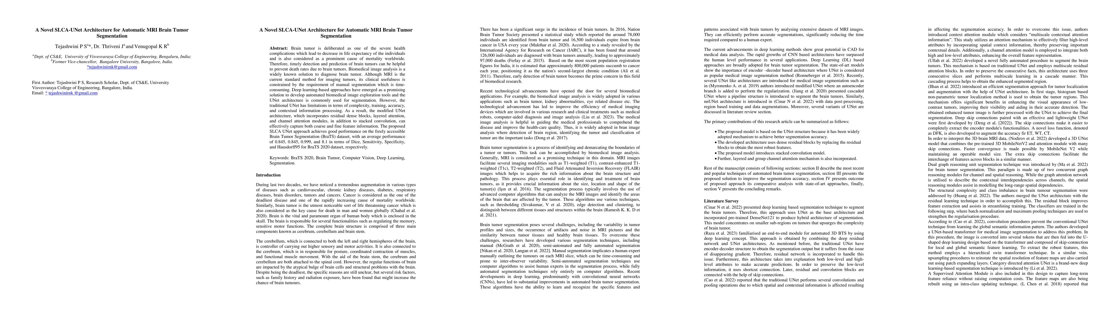 The paper proposes a novel SLCA-UNet architecture for automatic MRI brain tumor segmentation, addressing the limitations of traditional UNet with residual dense blocks, layered attention, and channel attention. The approach achieves high performance on the BraTS dataset, with an average Dice score of 0.845 and Hausdorff95 distance of 8.1.