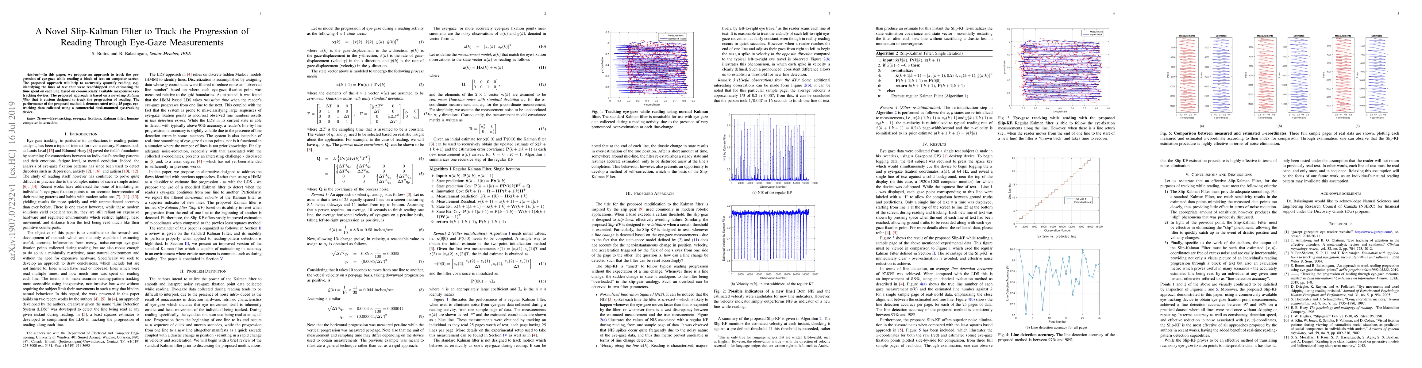 This paper introduces a novel Slip-Kalman filter to track reading progression via eye-gaze measurements, enabling precise quantification of reading, including identifying read/skipped lines and estimating time per line. The method's effectiveness is demonstrated using eye-tracking data from a commercial desk-mounted device.