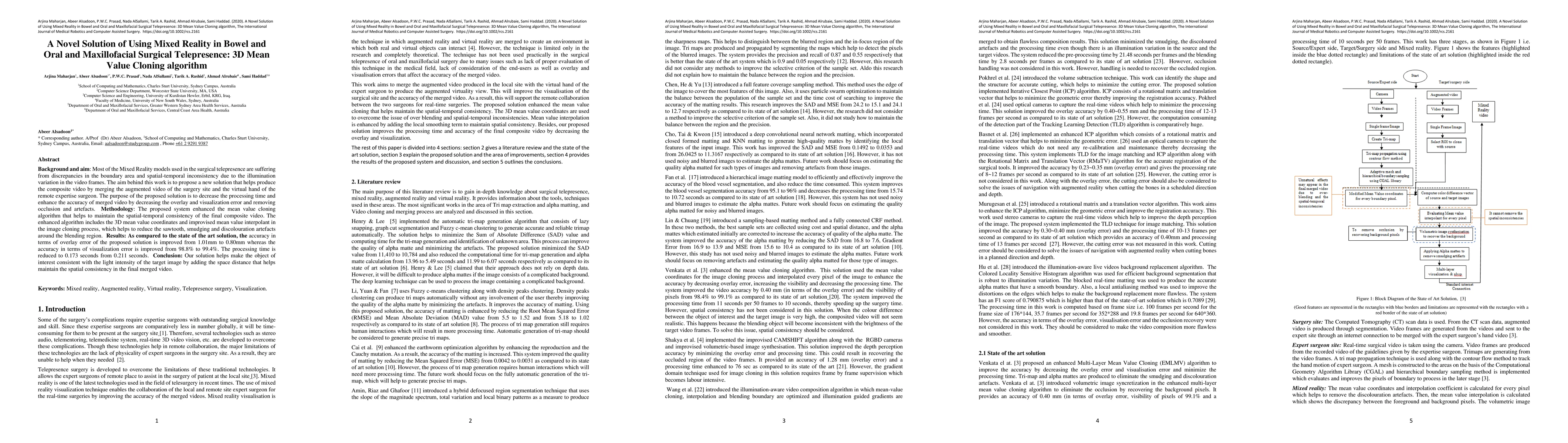 This paper proposes a novel Mixed Reality solution for surgical telepresence using an enhanced 3D mean value cloning algorithm to merge augmented and virtual elements, reducing overlay and visualization errors. The new algorithm improves accuracy and processing speed, achieving an overlay error of 0.80mm and visualization accuracy of 99.4%, while reducing processing time from 0.211 to 0.173 seconds.