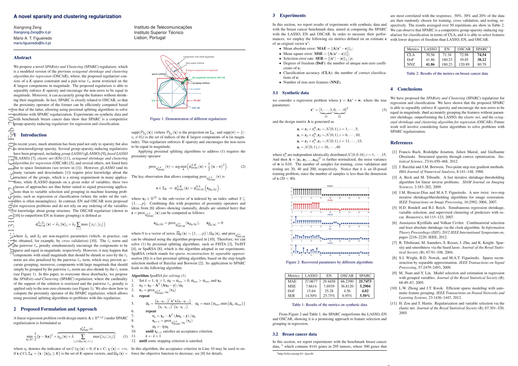 The paper introduces a novel SPARC regularizer that combines $K$-sparsity and clustering to enforce equal magnitudes on non-zero components while grouping features without shrinking them. It is shown to be competitive for regression and classification tasks based on experiments with synthetic and breast cancer data.