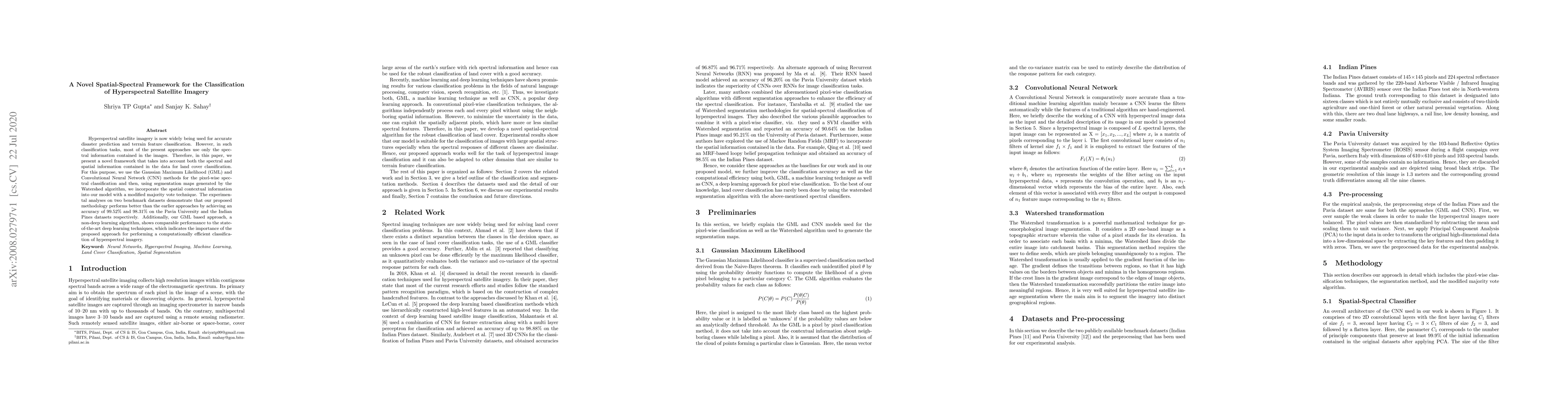 This paper introduces a novel spatial-spectral framework for hyperspectral satellite imagery classification, combining Gaussian Maximum Likelihood and Convolutional Neural Networks for spectral classification, and incorporating spatial context via a modified Watershed algorithm and majority vote technique. Experimental results show superior performance over existing methods, achieving accuracies of 99.52% and 98.31% on benchmark datasets.