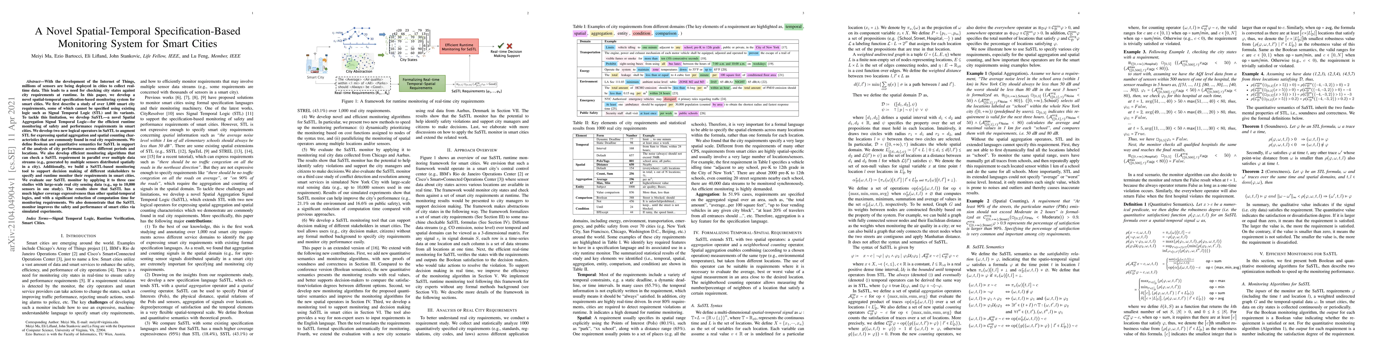 This paper introduces a novel spatial-temporal specification-based monitoring system, SaSTL, to efficiently monitor smart city requirements in real-time. It extends Signal Temporal Logic with new operators for spatial aggregation and counting, enabling enhanced expressiveness and performance monitoring across multiple sensor data streams.