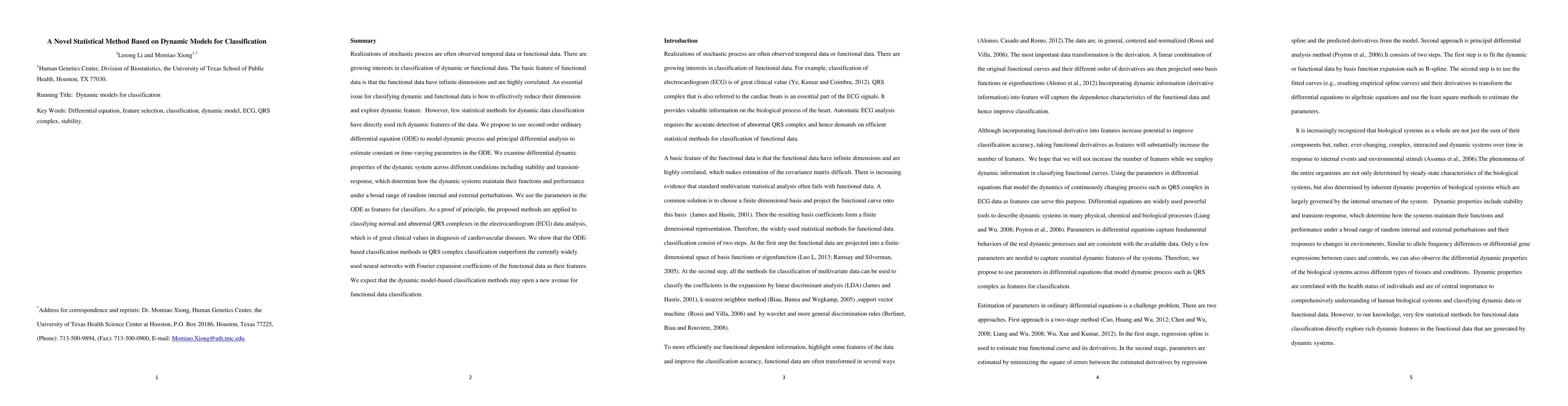 Realizations of stochastic process are often observed temporal data or functional data. There are growing interests in classification of dynamic or functional data. The basic feature of functional data is that the functional data have infinite dimensions and are highly correlated. An essential issue for classifying dynamic and functional data is how to effectively reduce their dimension and explore dynamic feature. However, few statistical methods for dynamic data classification have directly used rich dynamic features of the data. We propose to use second order ordinary differential equation (ODE) to model dynamic process and principal differential analysis to estimate constant or time-varying parameters in the ODE. We examine differential dynamic properties of the dynamic system across different conditions including stability and transient-response, which determine how the dynamic systems maintain their functions and performance under a broad range of random internal and external perturbations. We use the parameters in the ODE as features for classifiers. As a proof of principle, the proposed methods are applied to classifying normal and abnormal QRS complexes in the electrocardiogram (ECG) data analysis, which is of great clinical values in diagnosis of cardiovascular diseases. We show that the ODE-based classification methods in QRS complex classification outperform the currently widely used neural networks with Fourier expansion coefficients of the functional data as their features. We expect that the dynamic model-based classification methods may open a new avenue for functional data classification.