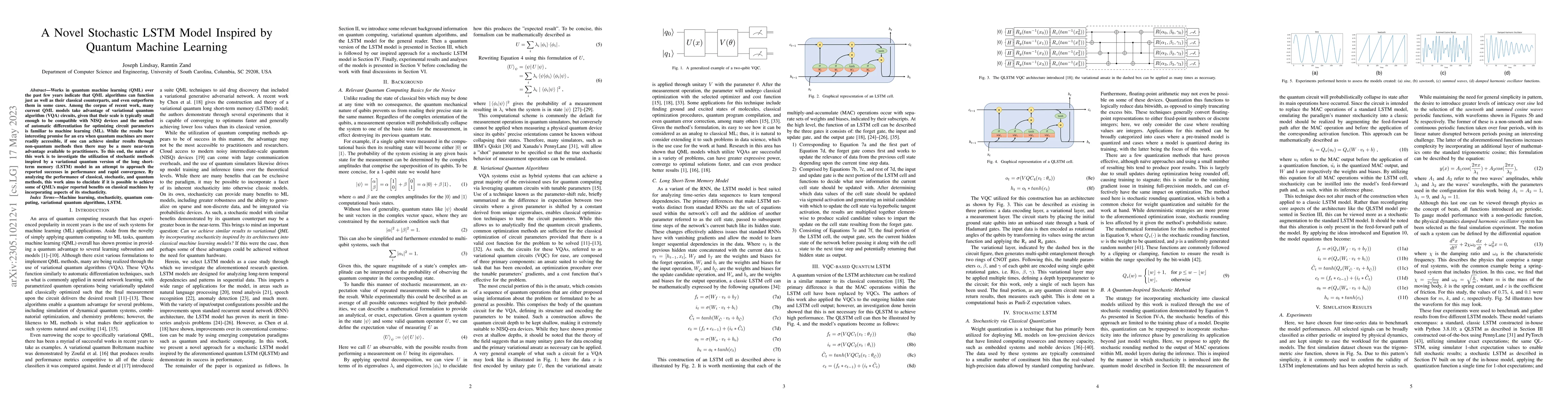 This paper explores a novel stochastic LSTM model inspired by quantum machine learning (QML) to achieve performance and convergence benefits comparable to those of quantum algorithms on classical machines. The study aims to determine if incorporating stochasticity from variational quantum algorithms can yield near-term advantages for practitioners.