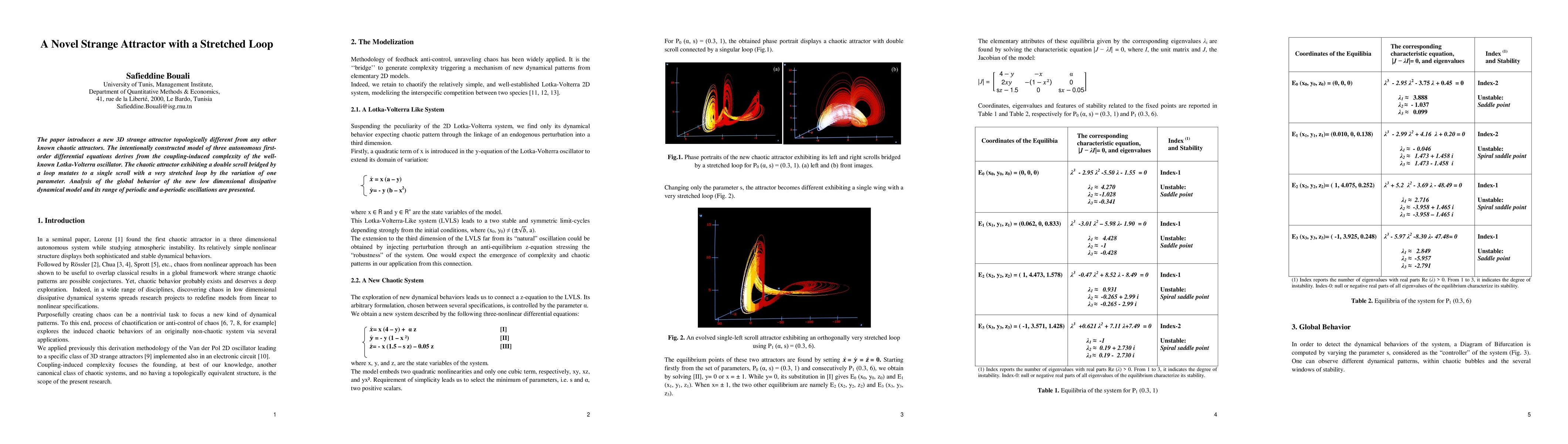The paper introduces a new 3D strange attractor topologically different from any other known chaotic attractors. The intentionally constructed model of three autonomous first-order differential equations derives from the coupling-induced complexity of the well-known Lotka-Volterra oscillator. The chaotic attractor exhibiting a double scroll bridged by a loop mutates to a single scroll with a very stretched loop by the variation of one parameter. Analysis of the global behavior of the new low dimensional dissipative dynamical model and its range of periodic and a-periodic oscillations are presented.