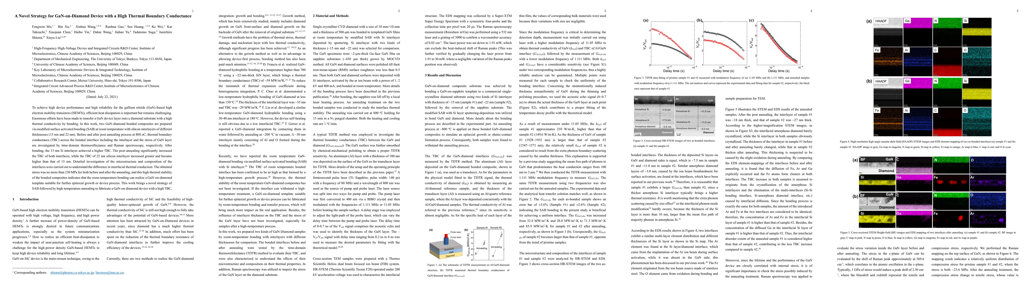 This research introduces a novel strategy utilizing modified surface activated bonding (SAB) and post-annealing to enhance the thermal boundary conductance in GaN-on-diamond devices. The study demonstrates that a 15 nm silicon interlayer achieves higher initial TBC, but post-annealing at 800°C significantly boosts the TBC of a 22 nm silicon interlayer, indicating stable, high-performance GaN-on-diamond composites suitable for further device fabrication.