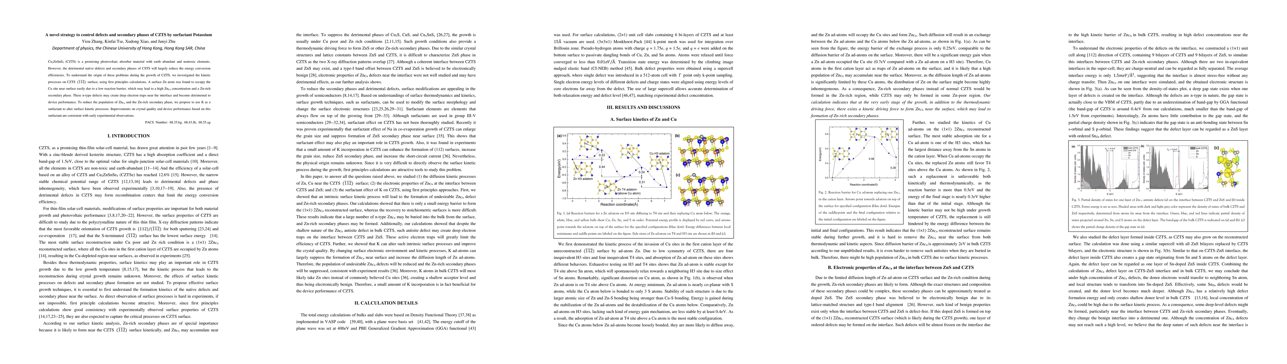Cu2ZnSnS4 (CZTS) is a promising photovoltaic absorber material with earth abundant and nontoxic elements. However, the detrimental native defects and secondary phases of CSTS will largely reduce the energy conversion efficiencies. To understand the origin of these problems during the growth of CZTS, we investigated the kinetic processes on CZTS (-1-1-2) surface, using first principles calculations. A surface Zn atom was found to occupy the subsurface Cu site easily due to a low reaction barrier, which may lead to a high ZnCu concentration and a secondary phase of ZnS. These n-type defects may create deep electron traps near the interface and become detrimental to device performance. To reduce the population of ZnCu and the secondary phase, we propose to use K as a surfactant to alter surface kinetic processes. Improvements on crystal quality and device performance based on this surfactant are consistent with early experimental observations.