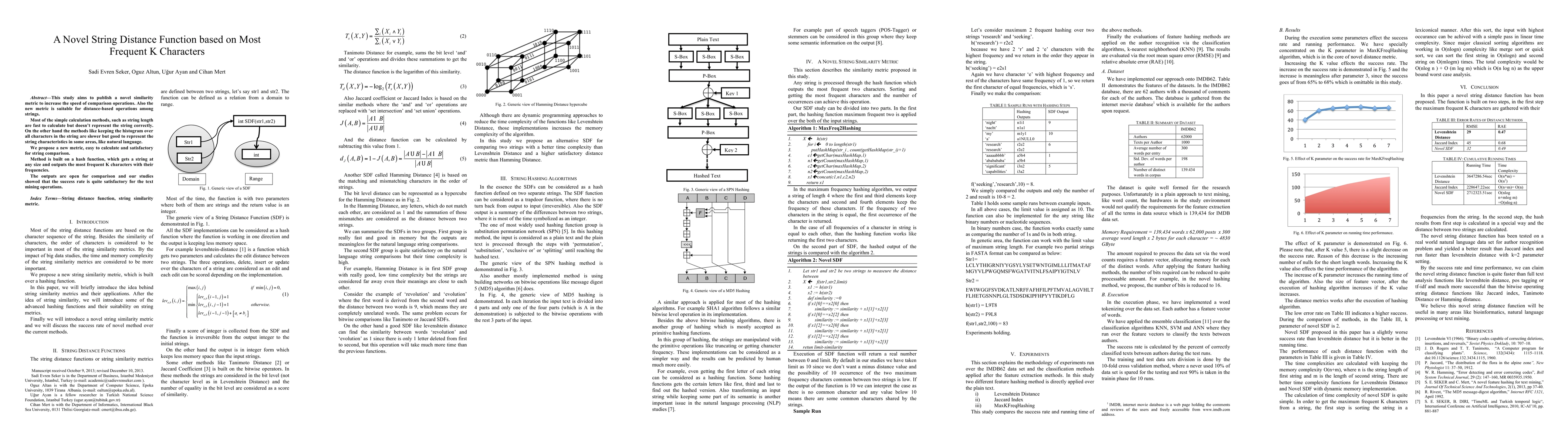 This paper introduces a novel string distance function based on the most frequent K characters, aiming to enhance the speed of comparison operations while maintaining satisfactory string representation. The proposed method uses a hash function to extract and compare the top K characters, demonstrating good performance in text mining applications.