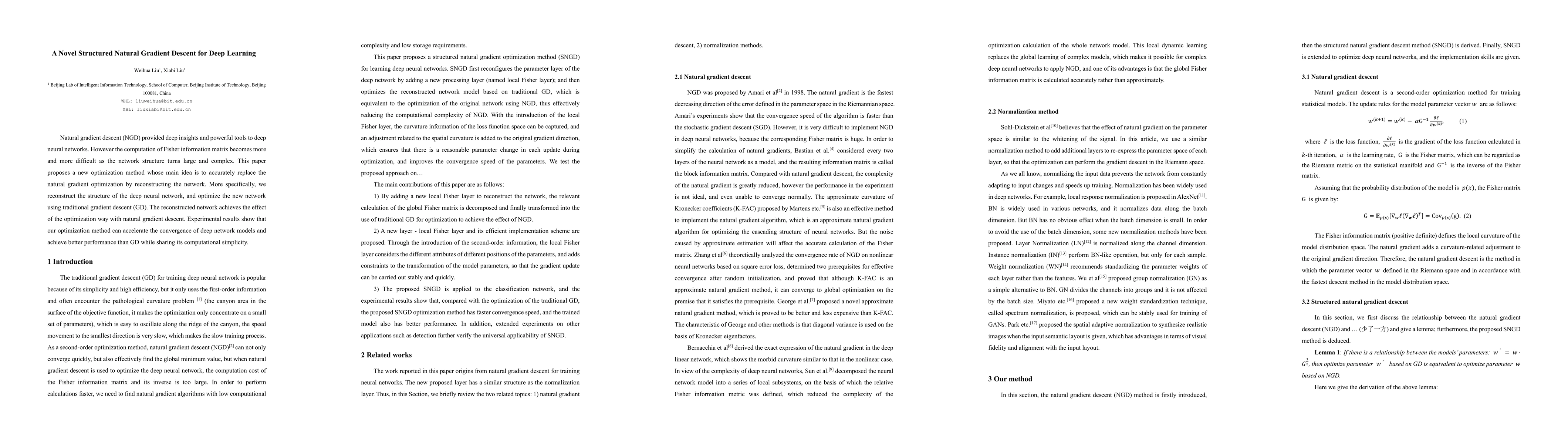 This paper introduces a novel structured natural gradient descent method for deep learning that reconstructs the neural network structure to optimize using traditional gradient descent, achieving the benefits of natural gradient descent with reduced computational complexity. Experimental results demonstrate faster convergence and better performance compared to traditional gradient descent.