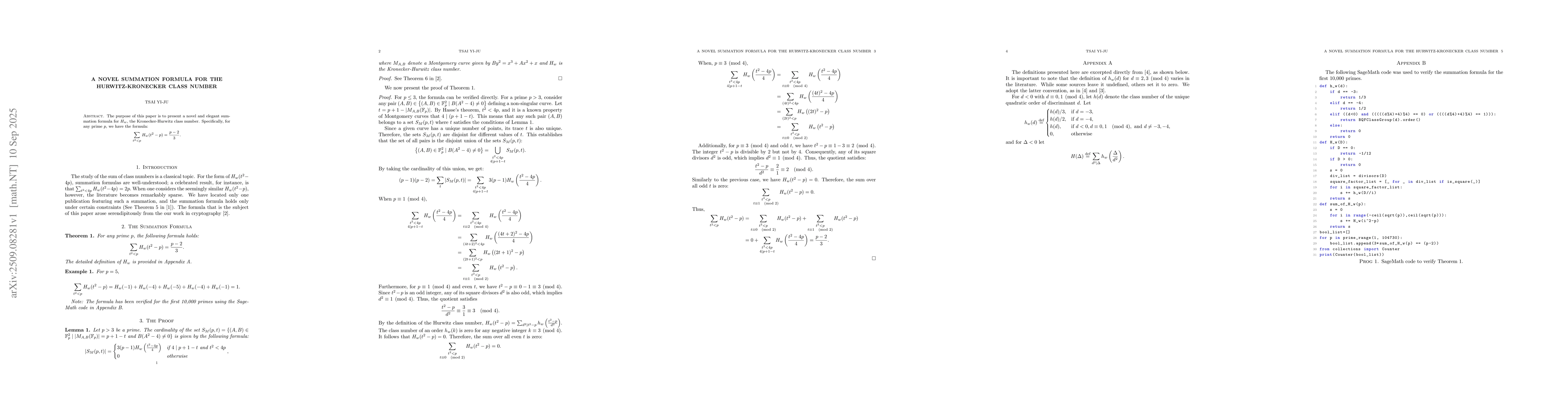 The purpose of this paper is to present a novel and elegant summation formula for $H_w$, the Kronecker-Hurwitz class number. Specifically, for any prime $p$, we have the formula: $$ \sum_{t^2