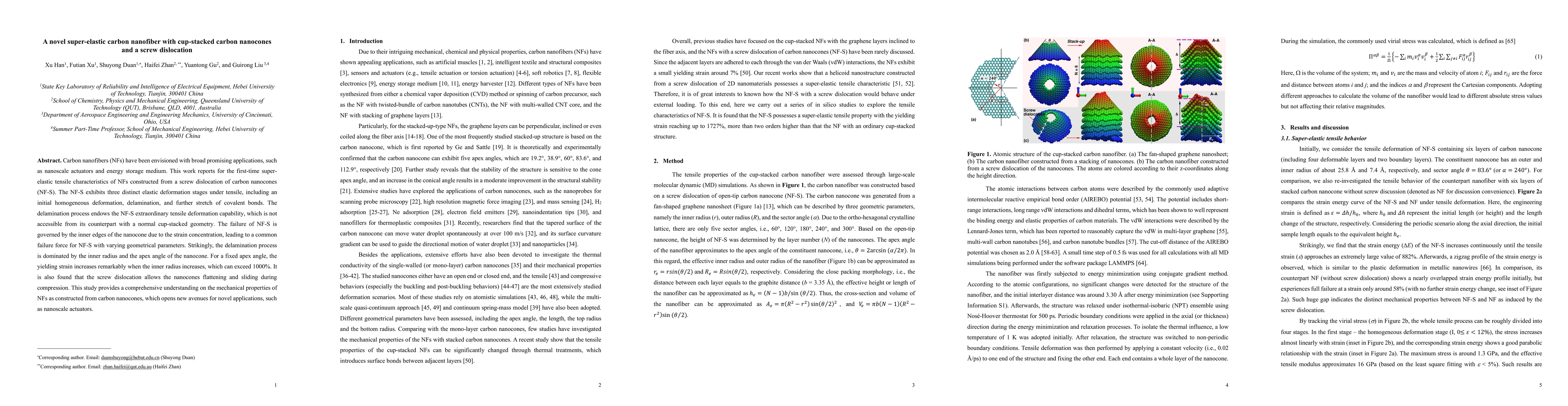 This research introduces a novel super-elastic carbon nanofiber (NF-S) with a screw dislocation of carbon nanocones, exhibiting extraordinary tensile deformation capabilities. The NF-S's mechanical properties, governed by nanocone inner edges and apex angle, could revolutionize nanoscale actuator applications.