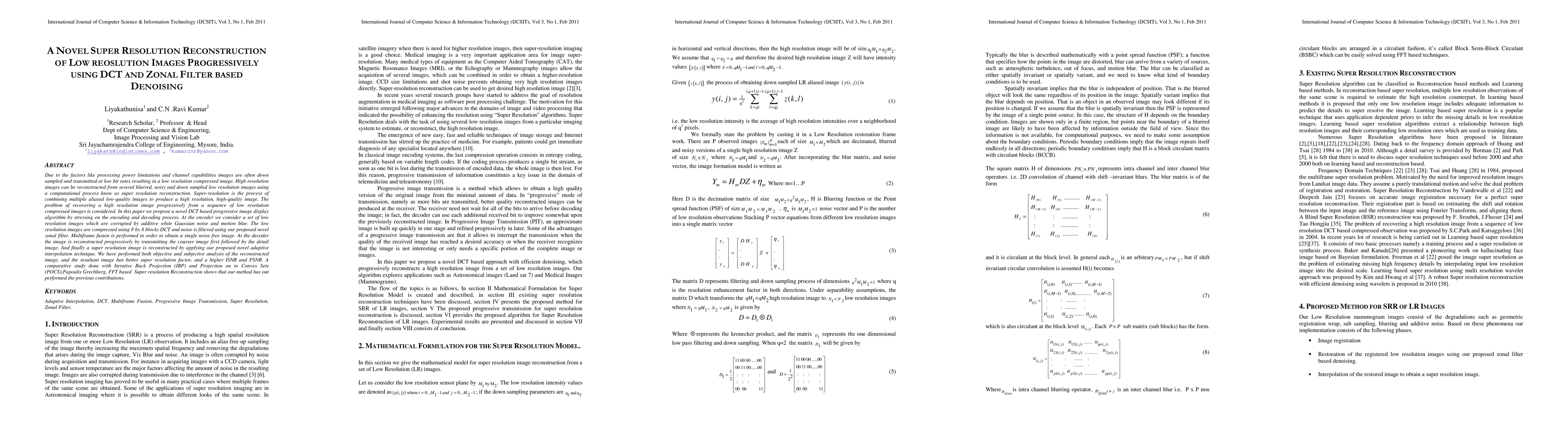 Due to the factors like processing power limitations and channel capabilities images are often down sampled and transmitted at low bit rates resulting in a low resolution compressed image. High resolution images can be reconstructed from several blurred, noisy and down sampled low resolution images using a computational process know as super resolution reconstruction. Super-resolution is the process of combining multiple aliased low-quality images to produce a high resolution, high-quality image. The problem of recovering a high resolution image progressively from a sequence of low resolution compressed images is considered. In this paper we propose a novel DCT based progressive image display algorithm by stressing on the encoding and decoding process. At the encoder we consider a set of low resolution images which are corrupted by additive white Gaussian noise and motion blur. The low resolution images are compressed using 8 by 8 blocks DCT and noise is filtered using our proposed novel zonal filter. Multiframe fusion is performed in order to obtain a single noise free image. At the decoder the image is reconstructed progressively by transmitting the coarser image first followed by the detail image. And finally a super resolution image is reconstructed by applying our proposed novel adaptive interpolation technique. We have performed both objective and subjective analysis of the reconstructed image, and the resultant image has better super resolution factor, and a higher ISNR and PSNR. A comparative study done with Iterative Back Projection (IBP) and Projection on to Convex Sets (POCS),Papoulis Grechberg, FFT based Super resolution Reconstruction shows that our method has out performed the previous contributions.