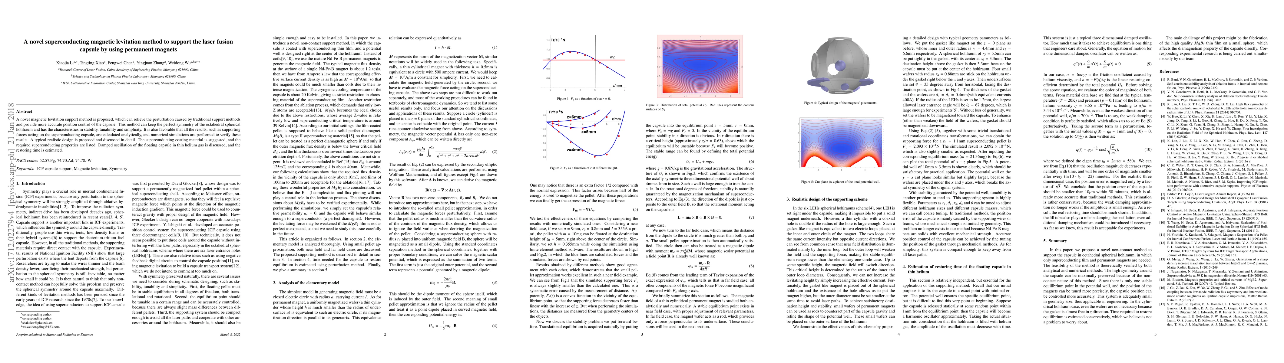 This paper proposes a novel superconducting magnetic levitation method using permanent magnets to support laser fusion capsules, offering improved stability, tunability, and symmetry. Analytical calculations and numerical simulations verify the method's effectiveness, with a detailed design and discussion of the required superconducting material properties.