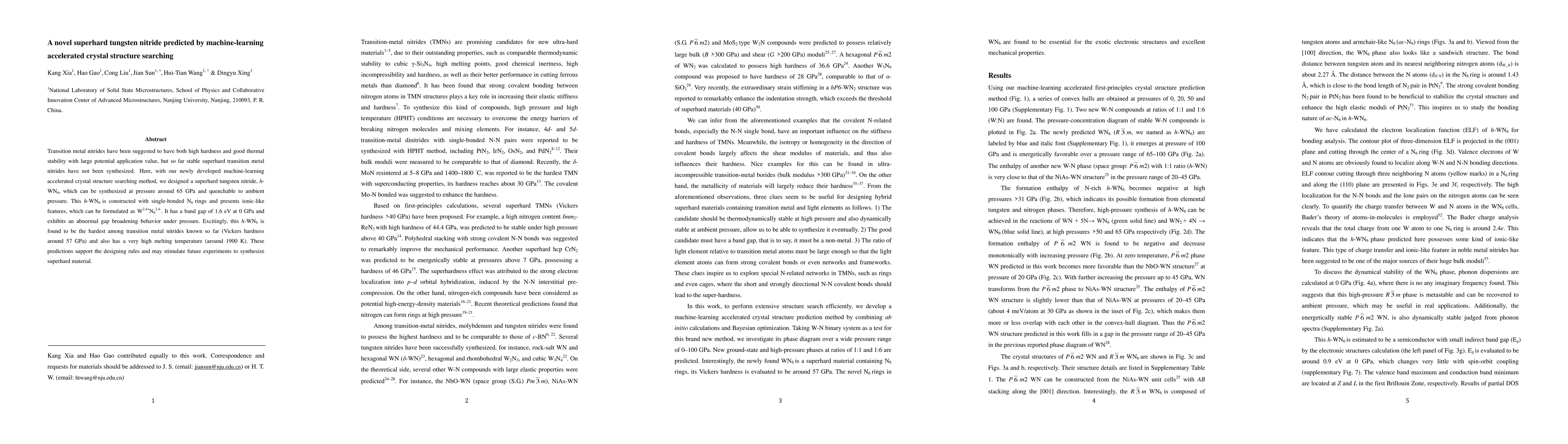 Researchers used machine-learning to predict a novel superhard tungsten nitride, h-WN6, which exhibits exceptional hardness and thermal stability. This material, synthesized at high pressures and quenchable to ambient conditions, is the hardest known transition metal nitride with a Vickers hardness of around 57 GPa.