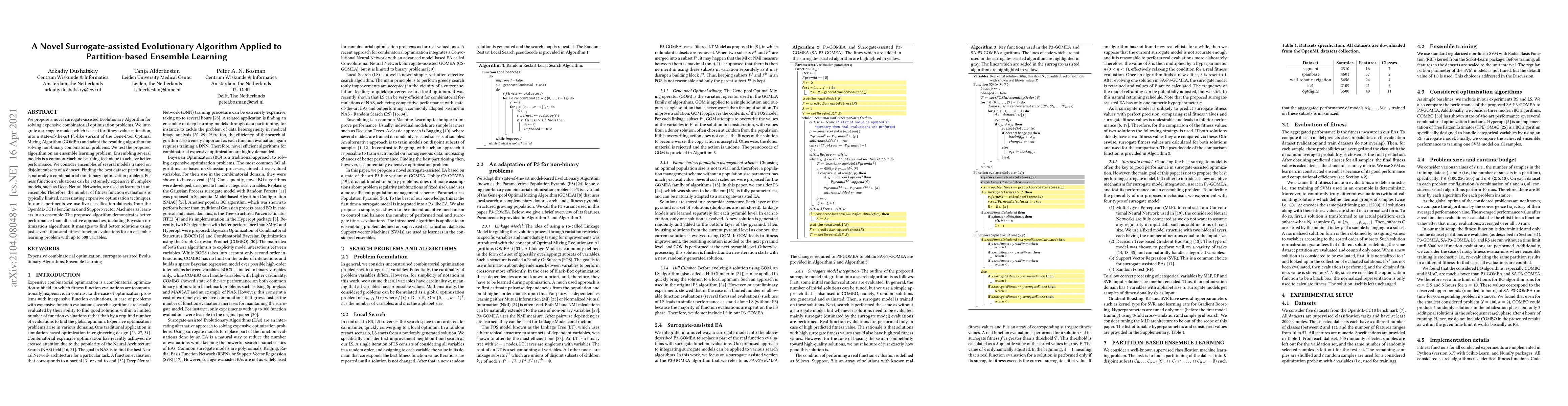 This paper proposes a novel surrogate-assisted Evolutionary Algorithm integrated with a P3-like variant of GOMEA to solve non-binary combinatorial optimization problems, specifically for partitioning-based ensemble learning. The algorithm demonstrates superior performance compared to alternative methods, achieving better solutions with fewer expensive fitness function evaluations.