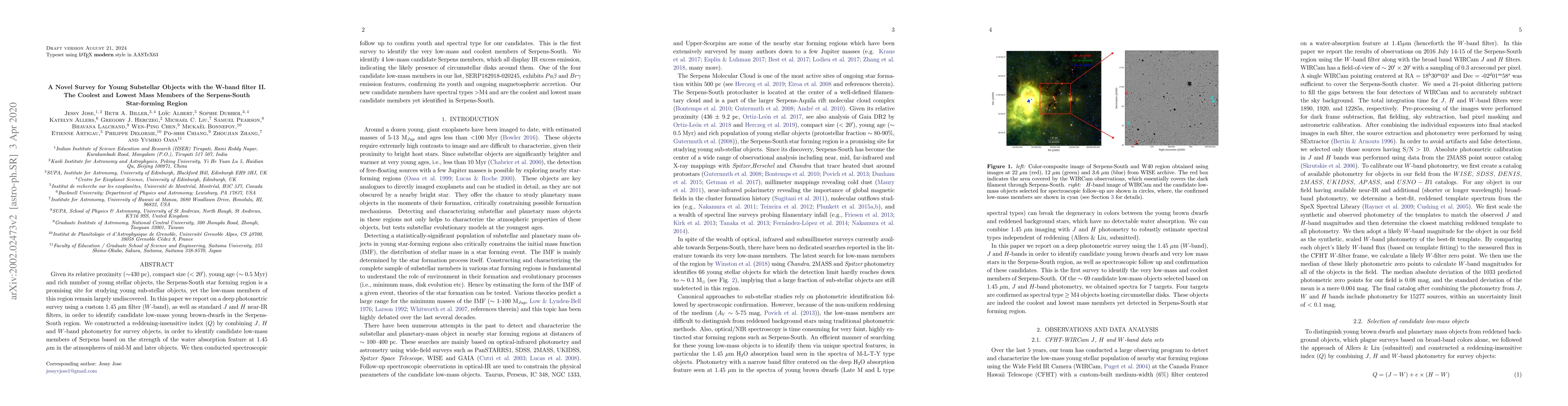 This paper reports a deep photometric survey using W-band, J, and H filters to identify low-mass young brown dwarfs in the Serpens-South star-forming region. The study confirms the presence of four very low-mass candidates with spectral types >M4, including one exhibiting ongoing magnetospheric accretion, making them the coolest and lowest mass members identified yet in the region.
