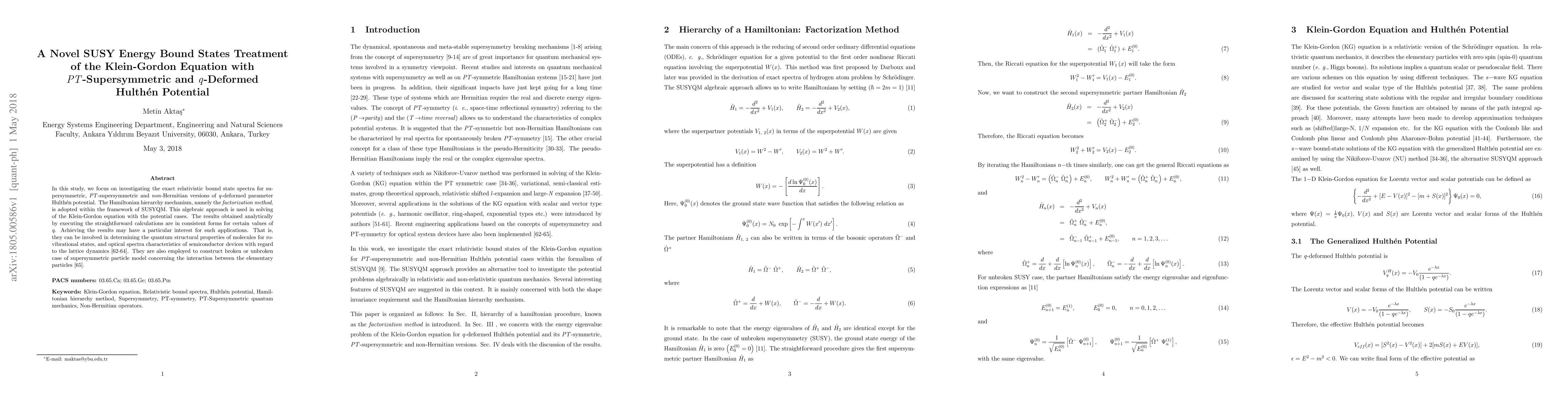 In this study, we focus on investigating the exact relativistic bound state spectra for supersymmetric, PT-supersymmetric and non-Hermitian versions of q-deformed parameter Hulthen potential. The Hamiltonian hierarchy mechanism, namely the factorization method, is adopted within the framework of SUSYQM. This algebraic approach is used in solving of the Klein-Gordon equation with the potential cases. The results obtained analytically by executing the straightforward calculations are in consistent forms for certain values of q. Achieving the results may have a particular interest for such applications. That is, they can be involved in determining the quantum structural properties of molecules for rovibrational states, and optical spectra characteristics of semiconductor devices with regard to the lattice dynamics [62-64]. They are also employed to construct broken or unbroken case of supersymmetric particle model concerning the interaction between the elementary particles [65].