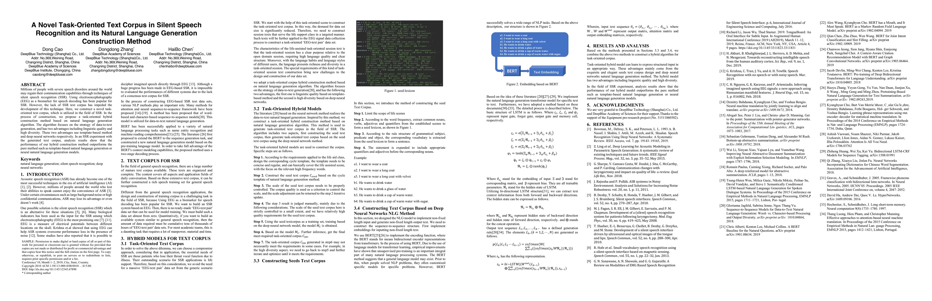 Millions of people with severe speech disorders around the world may regain their communication capabilities through techniques of silent speech recognition (SSR). Using electroencephalography (EEG) as a biomarker for speech decoding has been popular for SSR. However, the lack of SSR text corpus has impeded the development of this technique. Here, we construct a novel task-oriented text corpus, which is utilized in the field of SSR. In the process of construction, we propose a task-oriented hybrid construction method based on natural language generation algorithm. The algorithm focuses on the strategy of data-to-text generation, and has two advantages including linguistic quality and high diversity. These two advantages use template-based method and deep neural networks respectively. In an SSR experiment with the generated text corpus, analysis results show that the performance of our hybrid construction method outperforms the pure method such as template-based natural language generation or neural natural language generation models.