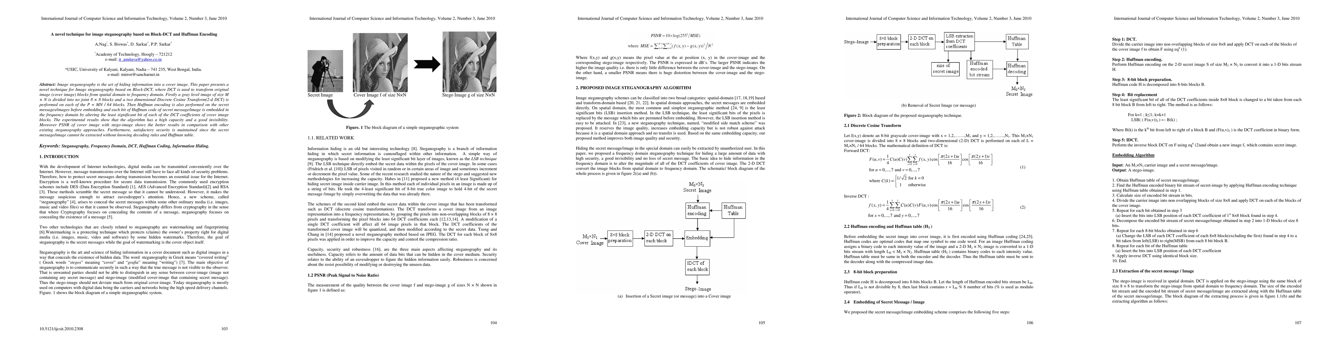 This paper introduces a new image steganography technique using Block-DCT and Huffman encoding, embedding secret messages in cover image blocks transformed via DCT and Huffman codes, achieving high capacity and invisibility with better PSNR results compared to other methods. Security is maintained through the need for decoding rules and Huffman tables.