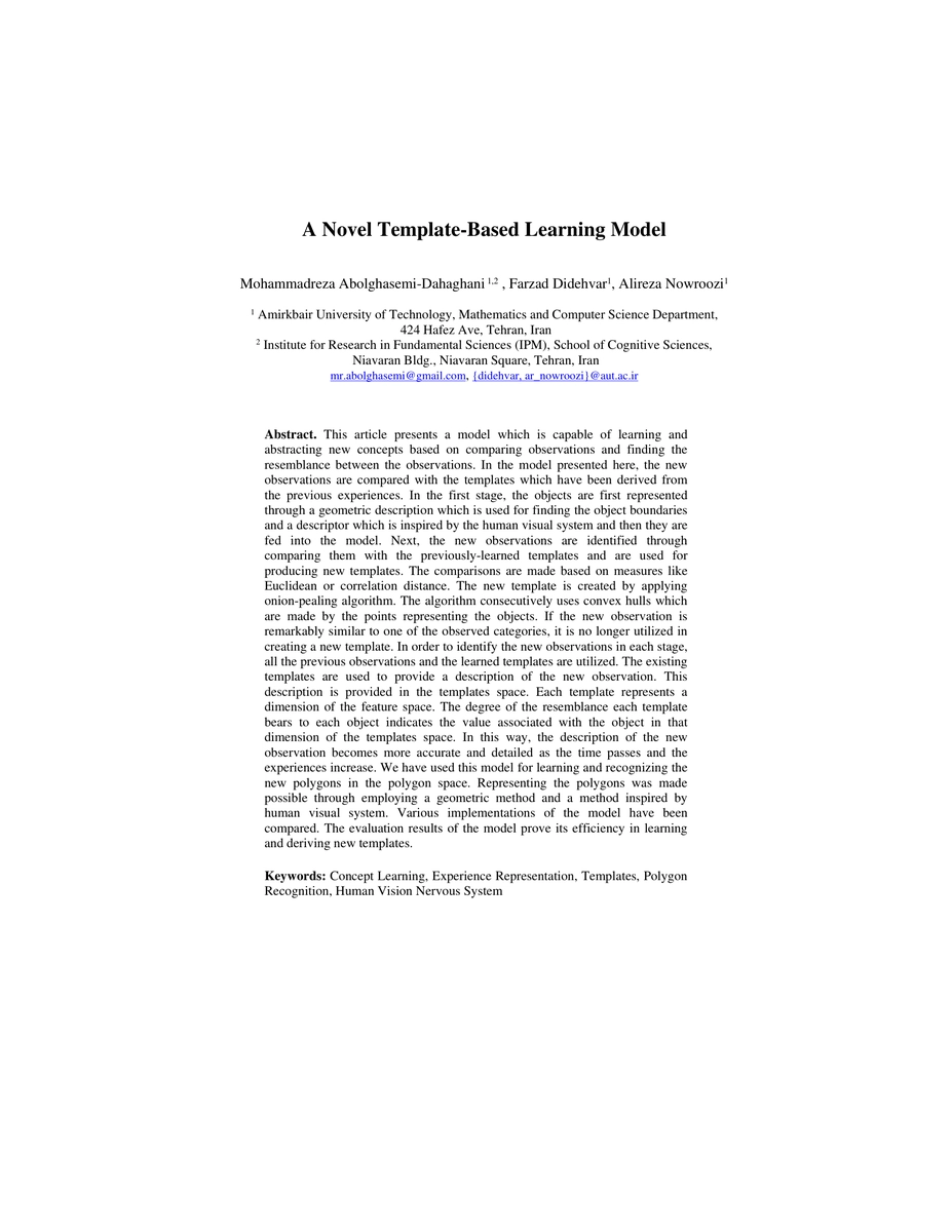 This article presents a model which is capable of learning and abstracting new concepts based on comparing observations and finding the resemblance between the observations. In the model, the new observations are compared with the templates which have been derived from the previous experiences. In the first stage, the objects are first represented through a geometric description which is used for finding the object boundaries and a descriptor which is inspired by the human visual system and then they are fed into the model. Next, the new observations are identified through comparing them with the previously-learned templates and are used for producing new templates. The comparisons are made based on measures like Euclidean or correlation distance. The new template is created by applying onion-pealing algorithm. The algorithm consecutively uses convex hulls which are made by the points representing the objects. If the new observation is remarkably similar to one of the observed categories, it is no longer utilized in creating a new template. The existing templates are used to provide a description of the new observation. This description is provided in the templates space. Each template represents a dimension of the feature space. The degree of the resemblance each template bears to each object indicates the value associated with the object in that dimension of the templates space. In this way, the description of the new observation becomes more accurate and detailed as the time passes and the experiences increase. We have used this model for learning and recognizing the new polygons in the polygon space. Representing the polygons was made possible through employing a geometric method and a method inspired by human visual system. Various implementations of the model have been compared. The evaluation results of the model prove its efficiency in learning and deriving new templates.