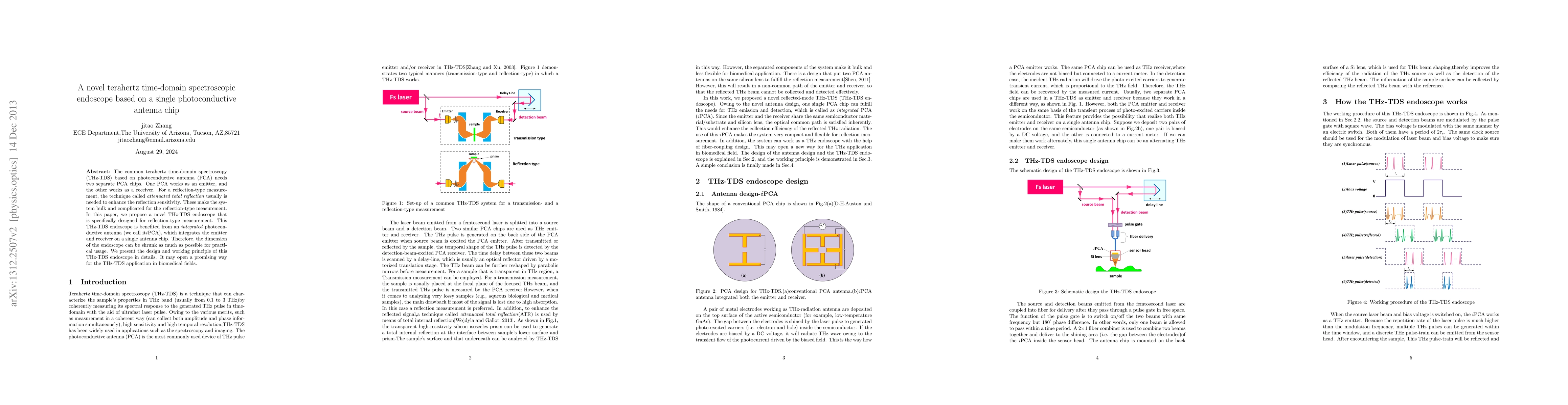 The novelty of this work lies in the integration of emitter and receiver functions on a single antenna chip, which simplifies the THz-TDS endoscope design and makes it more compact and flexible for reflection-type measurements in biomedical applications.