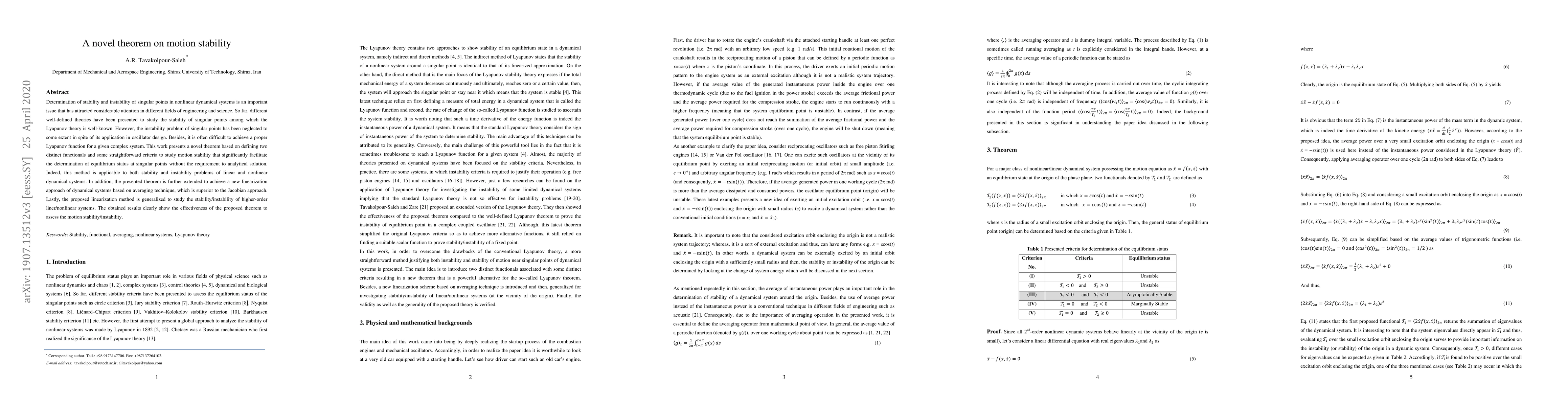 Determination of stability and instability of singular points in nonlinear dynamical systems is an important issue that has attracted considerable attention in different fields of engineering and science. So far, different well-defined theories have been presented to study the stability of singular points among which the Lyapunov theory is well-known. However, the instability problem of singular points has been neglected to some extent in spite of its application in oscillator design. Besides, it is often difficult to achieve a proper Lyapunov function for a given complex system. This work presents a novel theorem based on defining two distinct functionals and some straightforward criteria to study motion stability that significantly facilitate the determination of equilibrium status at singular points without the requirement to analytical solution. Indeed, this method is applicable to both stability and instability problems of linear and nonlinear dynamical systems. In addition, the presented theorem is further extended to achieve a new linearization approach of dynamical systems based on averaging technique, which is superior to the Jacobian approach. Lastly, the proposed linearization method is generalized to study the stability/instability of higher-order liner/nonlinear systems. The obtained results clearly show the effectiveness of the proposed theorem to assess the motion stability/instability.