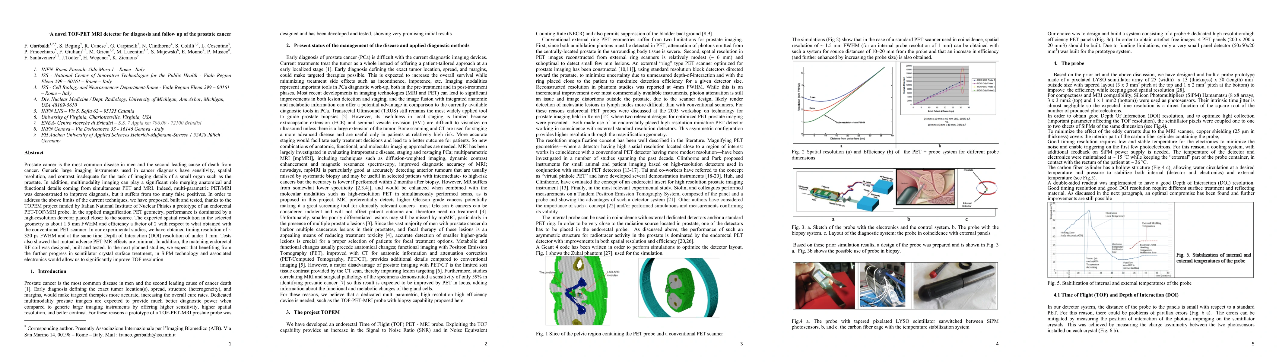 Prostate cancer is the most common disease in men and the second leading cause of death from cancer. Generic large imaging instruments used in cancer diagnosis have sensitivity, spatial resolution, and contrast inadequate for the task of imaging details of a small organ such as the prostate. In addition, multimodality imaging can play a significant role merging anatomical and functional details coming from simultaneous PET and MRI. Indeed, multi-parametric PET/MRI was demonstrated to improve diagnosis, but it suffers from too many false positives. In order to address the above limits of the current techniques, we have proposed, built and tested, thanks to the TOPEM project funded by Italian National Institute of Nuclear Phisics a prototype of an endorectal PET-TOF/MRI probe. In the applied magnification PET geometry, performance is dominated by a high-resolution detector placed closer to the source. The expected spatial resolution in the selected geometry is about 1.5 mm FWHM and efficiency a factor of 2 with respect to what obtained with the conventional PET scanner. In our experimental studies, we have obtained timing resolution of ~ 320 ps FWHM and at the same time Depth of Interaction (DOI) resolution of under 1 mm. Tests also showed that mutual adverse PET-MR effects are minimal. In addition, the matching endorectal RF coil was designed, built and tested. In the next planned studies, we expect that benefiting from the further progress in scintillator crystal surface treatment, in SiPM technology and associated electronics would allow us to significantly improve TOF resolution
