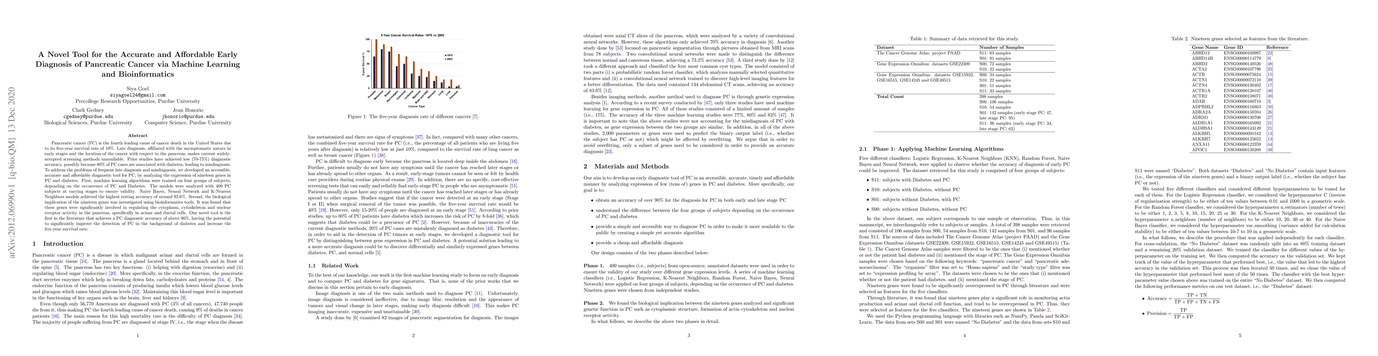 Pancreatic cancer (PC) is the fourth leading cause of cancer death in the United States due to its five-year survival rate of 10%. Late diagnosis, affiliated with the asymptomatic nature in early stages and the location of the cancer with respect to the pancreas, makes current widely-accepted screening methods unavailable. Prior studies have achieved low (70-75%) diagnostic accuracy, possibly because 80% of PC cases are associated with diabetes, leading to misdiagnosis. To address the problems of frequent late diagnosis and misdiagnosis, we developed an accessible, accurate and affordable diagnostic tool for PC, by analyzing the expression of nineteen genes in PC and diabetes. First, machine learning algorithms were trained on four groups of subjects, depending on the occurrence of PC and Diabetes. The models were analyzed with 400 PC subjects at varying stages to ensure validity. Naive Bayes, Neural Network and K-Nearest Neighbors models achieved the highest testing accuracy of around 92.6%. Second, the biological implication of the nineteen genes was investigated using bioinformatics tools. It was found that these genes were significantly involved in regulating the cytoplasm, cytoskeleton and nuclear receptor activity in the pancreas, specifically in acinar and ductal cells. Our novel tool is the first in the literature that achieves a PC diagnostic accuracy of above 90%, having the potential to significantly improve the detection of PC in the background of diabetes and increase the five-year survival rate.