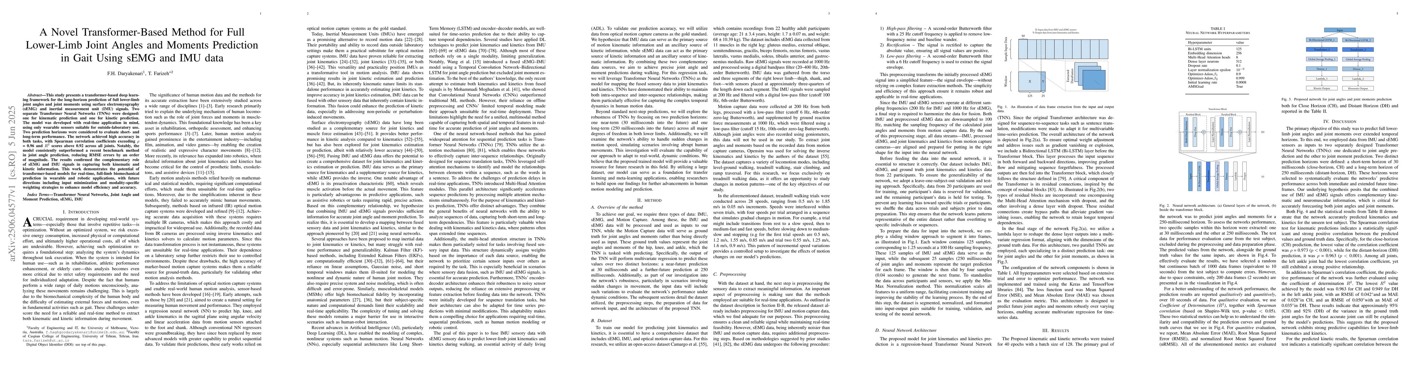 A transformer-based method predicts full lower-limb joint angles and moments with high accuracy using sEMG and IMU data, outperforming a benchmark method in joint angle prediction.
