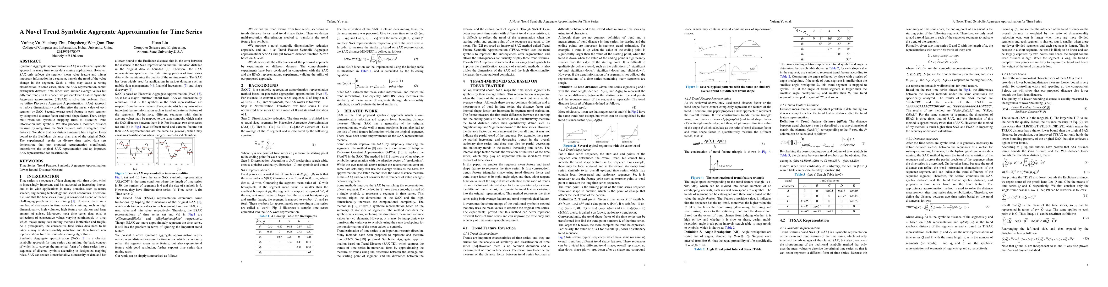 This paper introduces Trend Feature Symbolic Aggregate Approximation (TFSAX) to enhance time series classification by incorporating trend information beyond segment mean values. TFSAX combines SAX with trend features extracted via trend distance and shape factors, and a modified distance measure that integrates SAX and trend distances, outperforming original SAX in classification tasks.