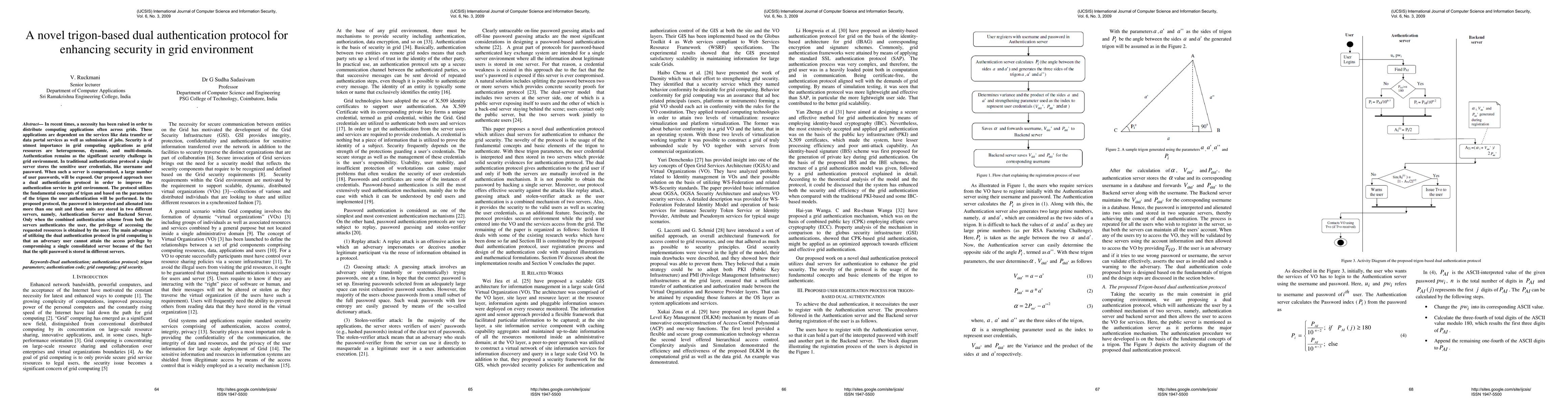 This paper proposes a novel dual authentication protocol based on trigon concepts to enhance security in grid computing environments. The protocol splits user passwords into multiple units stored across two servers, ensuring that only combined authentication from both servers grants access, thereby preventing a single server compromise from exposing user credentials.