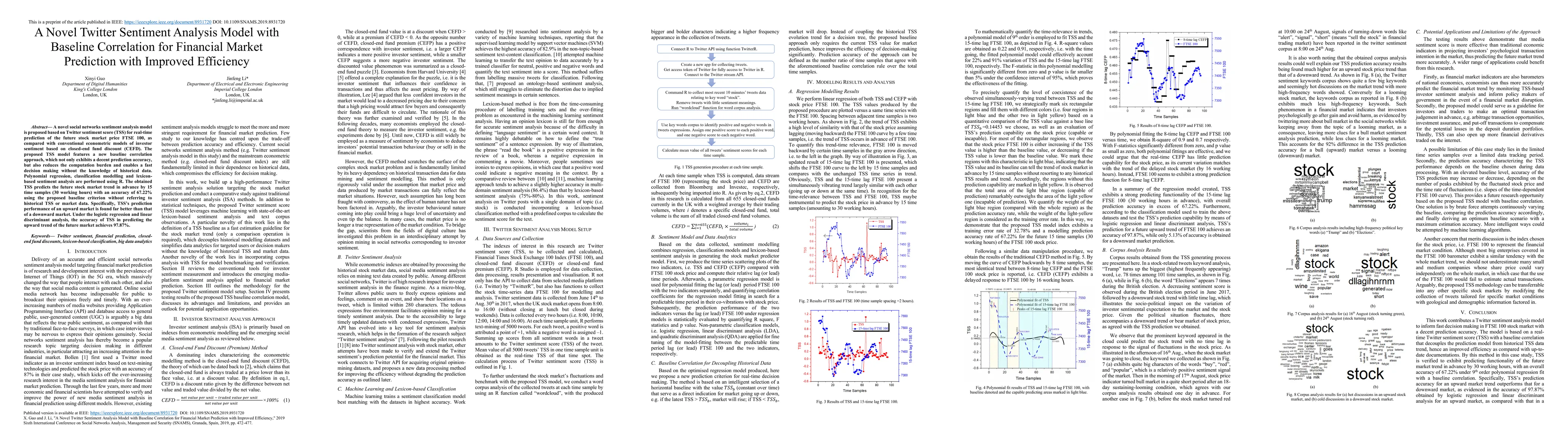 A novel social networks sentiment analysis model is proposed based on Twitter sentiment score (TSS) for real-time prediction of the future stock market price FTSE 100, as compared with conventional econometric models of investor sentiment based on closed-end fund discount (CEFD). The proposed TSS model features a new baseline correlation approach, which not only exhibits a decent prediction accuracy, but also reduces the computation burden and enables a fast decision making without the knowledge of historical data. Polynomial regression, classification modelling and lexicon-based sentiment analysis are performed using R. The obtained TSS predicts the future stock market trend in advance by 15 time samples (30 working hours) with an accuracy of 67.22% using the proposed baseline criterion without referring to historical TSS or market data. Specifically, TSS's prediction performance of an upward market is found far better than that of a downward market. Under the logistic regression and linear discriminant analysis, the accuracy of TSS in predicting the upward trend of the future market achieves 97.87%.