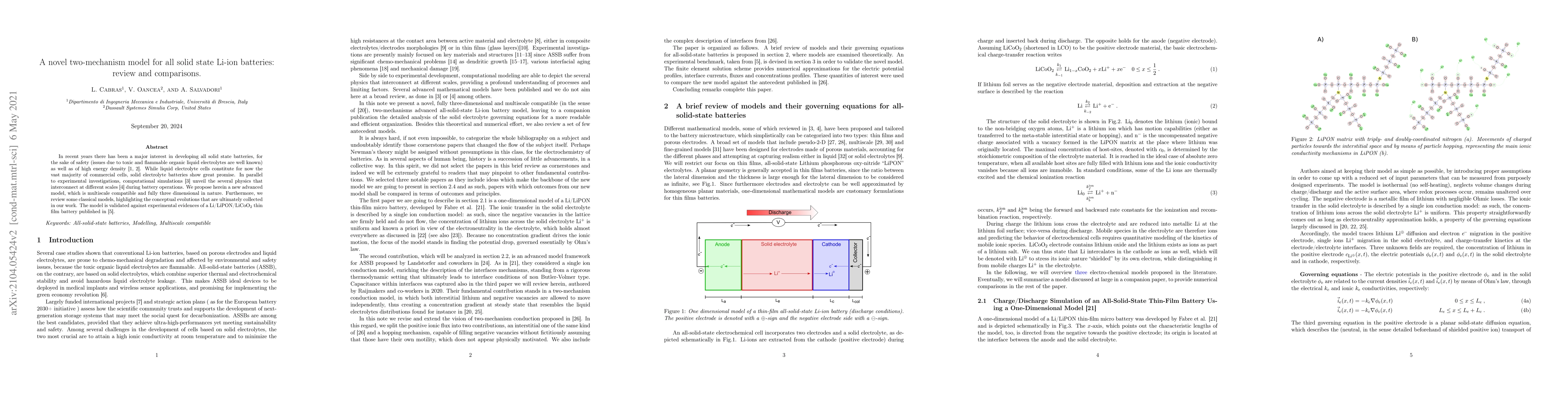 In recent years there has been a major interest in developing all solid state batteries, for the sake of safety (issues due to toxic and flammable organic liquid electrolytes are well known) as well as of high energy density \cite{SCHNELL2018160,Zheng2018}. Side by side to experimental investigations, computational simulations \cite{GrazioliEtAlCM2016} unveil the several physics that interconnect at different scales \cite{LiMonroeARCBM2020} during battery operations. %Several advanced mathematical models have therefore been published \cite{bistriM2020}. We propose herein a new advanced model, which is multiscale compatible and fully three dimensional in nature. Furthermore, we review some classical or inspiring models, highlighting the conceptual evolutions that are ultimately collected in our work. The model is validated against experimental evidences of a Li/LiPON/LiCoO$_2$ thin film battery published in \cite{Danilovetal2011}.