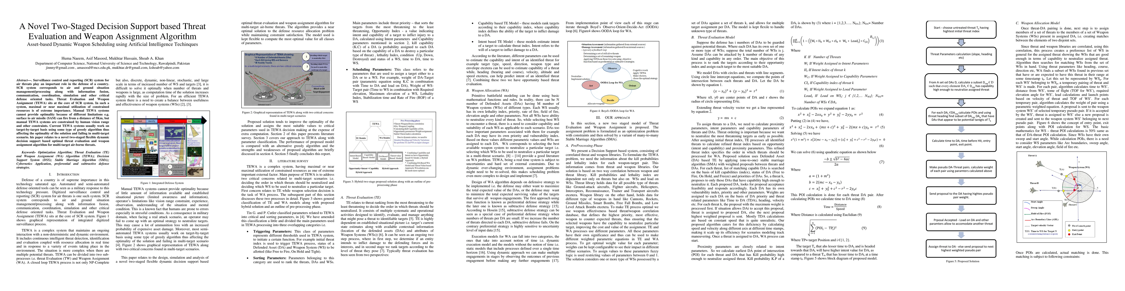 Surveillance control and reporting (SCR) system for air threats play an important role in the defense of a country. SCR system corresponds to air and ground situation management/processing along with information fusion, communication, coordination, simulation and other critical defense oriented tasks. Threat Evaluation and Weapon Assignment (TEWA) sits at the core of SCR system. In such a system, maximal or near maximal utilization of constrained resources is of extreme importance. Manual TEWA systems cannot provide optimality because of different limitations e.g.surface to air missile (SAM) can fire from a distance of 5Km, but manual TEWA systems are constrained by human vision range and other constraints. Current TEWA systems usually work on target-by-target basis using some type of greedy algorithm thus affecting the optimality of the solution and failing in multi-target scenario. his paper relates to a novel two-staged flexible dynamic decision support based optimal threat evaluation and weapon assignment algorithm for multi-target air-borne threats.