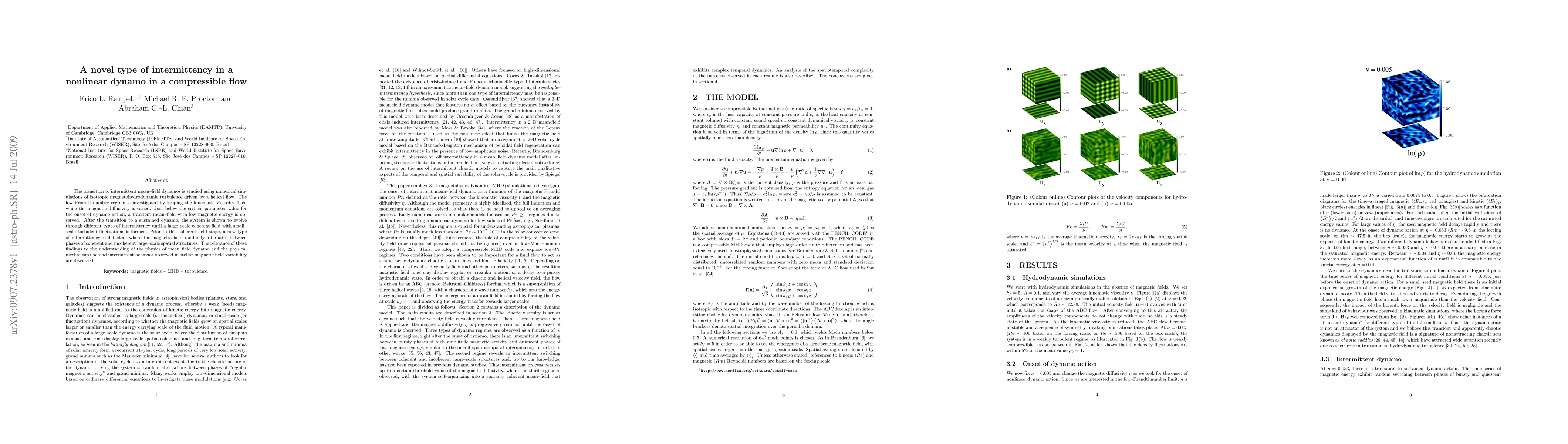 The transition to intermittent mean--field dynamos is studied using numerical simulations of isotropic magnetohydrodynamic turbulence driven by a helical flow. The low-Prandtl number regime is investigated by keeping the kinematic viscosity fixed while the magnetic diffusivity is varied. Just below the critical parameter value for the onset of dynamo action, a transient mean--field with low magnetic energy is observed. After the transition to a sustained dynamo, the system is shown to evolve through different types of intermittency until a large--scale coherent field with small--scale turbulent fluctuations is formed. Prior to this coherent field stage, a new type of intermittency is detected, where the magnetic field randomly alternates between phases of coherent and incoherent large--scale spatial structures. The relevance of these findings to the understanding of the physics of mean--field dynamo and the physical mechanisms behind intermittent behavior observed in stellar magnetic field variability are discussed.