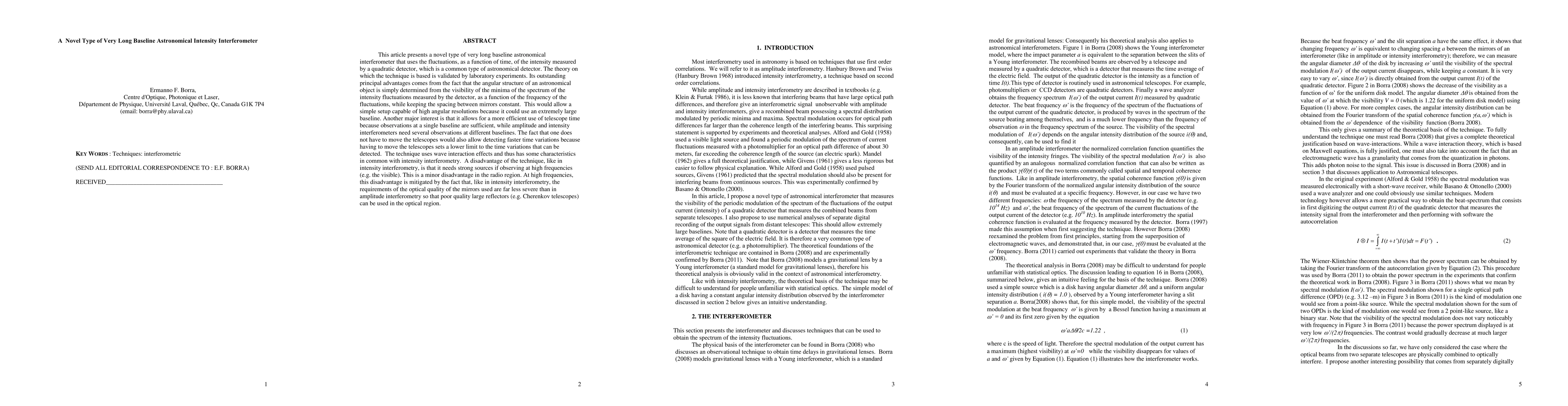 This article presents a novel type of very long baseline astronomical interferometer that uses the fluctuations, as a function of time, of the intensity measured by a quadratic detector, which is a common type of astronomical detector. The theory on which the technique is based is validated by laboratory experiments. Its outstanding principal advantages comes from the fact that the angular structure of an astronomical object is simply determined from the visibility of the minima of the spectrum of the intensity fluctuations measured by the detector, as a function of the frequency of the fluctuations, while keeping the spacing between mirrors constant. This would allow a simple setup capable of high angular resolutions because it could use an extremely large baseline. Another major interest is that it allows for a more efficient use of telescope time because observations at a single baseline are sufficient, while amplitude and intensity interferometers need several observations at different baselines. The fact that one does not have to move the telescopes would also allow detecting faster time variations because having to move the telescopes sets a lower limit to the time variations that can be detected. The technique uses wave interaction effects and thus has some characteristics in common with intensity interferometry. A disadvantage of the technique, like in intensity interferometry, is that it needs strong sources if observing at high frequencies (e.g. the visible). This is a minor disadvantage in the radio region. At high frequencies, this disadvantage is mitigated by the fact that, like in intensity interferometry, the requirements of the optical quality of the mirrors used are far less severe than in amplitude interferometry so that poor quality large reflectors (e.g. Cherenkov telescopes) can be used in the optical region.