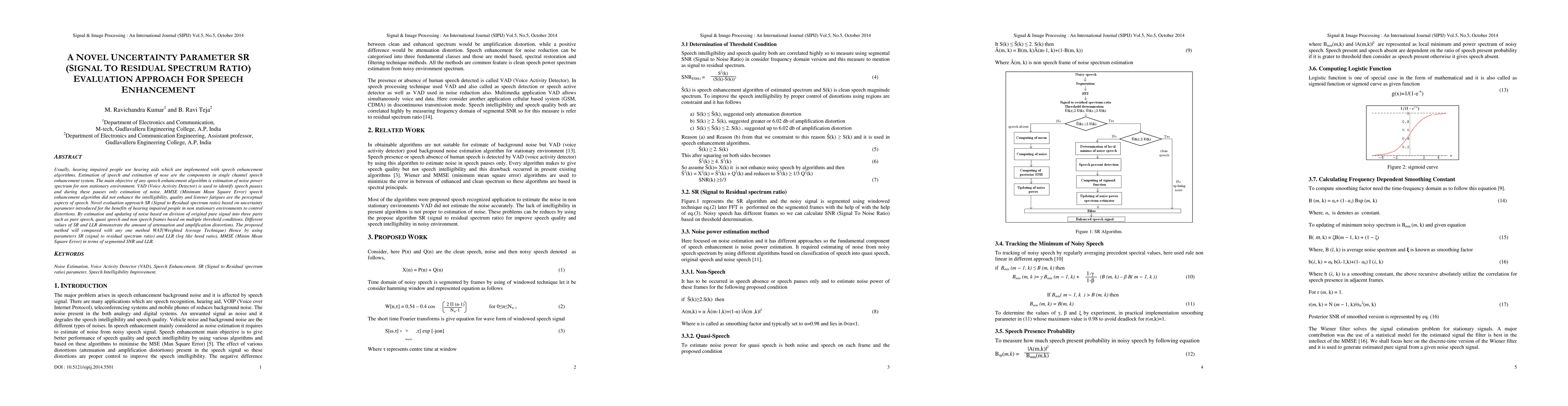 Usually, hearing impaired people use hearing aids which are implemented with speech enhancement algorithms. Estimation of speech and estimation of nose are the components in single channel speech enhancement system. The main objective of any speech enhancement algorithm is estimation of noise power spectrum for non stationary environment. VAD (Voice Activity Detector) is used to identify speech pauses and during these pauses only estimation of noise. MMSE (Minimum Mean Square Error) speech enhancement algorithm did not enhance the intelligibility, quality and listener fatigues are the perceptual aspects of speech. Novel evaluation approach SR (Signal to Residual spectrum ratio) based on uncertainty parameter introduced for the benefits of hearing impaired people in non stationary environments to control distortions. By estimation and updating of noise based on division of original pure signal into three parts such as pure speech, quasi speech and non speech frames based on multiple threshold conditions. Different values of SR and LLR demonstrate the amount of attenuation and amplification distortions. The proposed method will compared with any one method WAT(Weighted Average Technique) Hence by using parameters SR (signal to residual spectrum ratio) and LLR (log like hood ratio), MMSE (Minim Mean Square Error) in terms of segmented SNR and LLR.