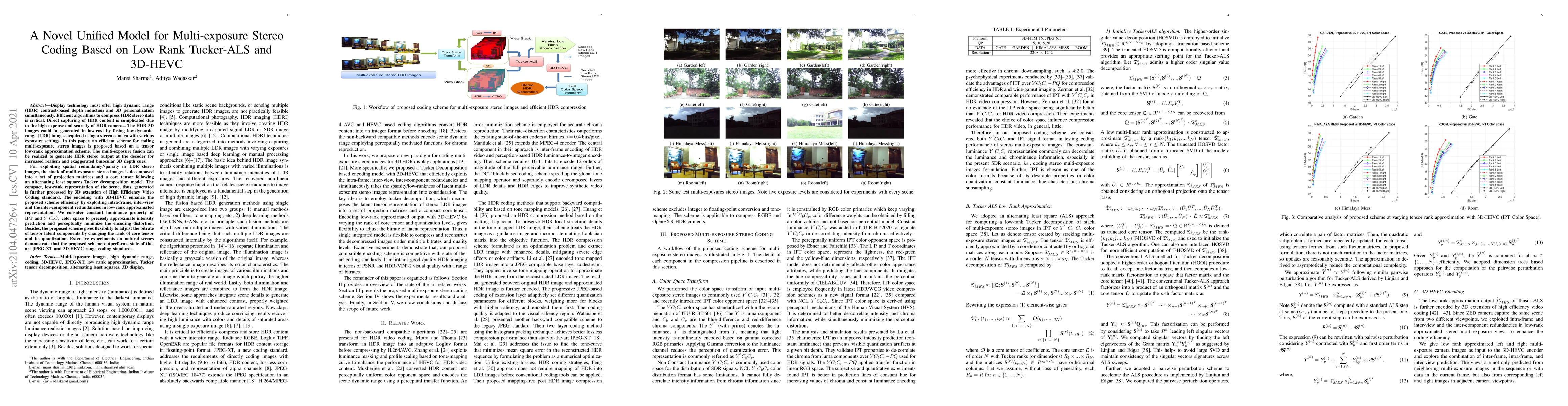 A new method for compressing stereo images with multiple exposures is proposed, using a low-rank approximation scheme that combines spatial redundancy and 3D video coding for efficient compression.