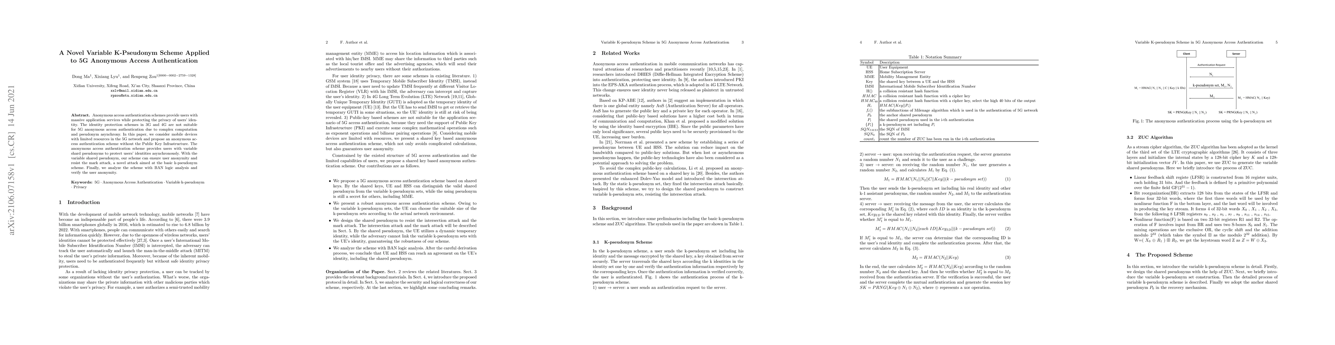 This paper proposes a novel variable k-pseudonym scheme for 5G anonymous access authentication, addressing the limitations of previous schemes in 3G and 4G. The scheme ensures user anonymity and resists mark attacks without relying on Public Key Infrastructure, suitable for mobile devices with limited resources.