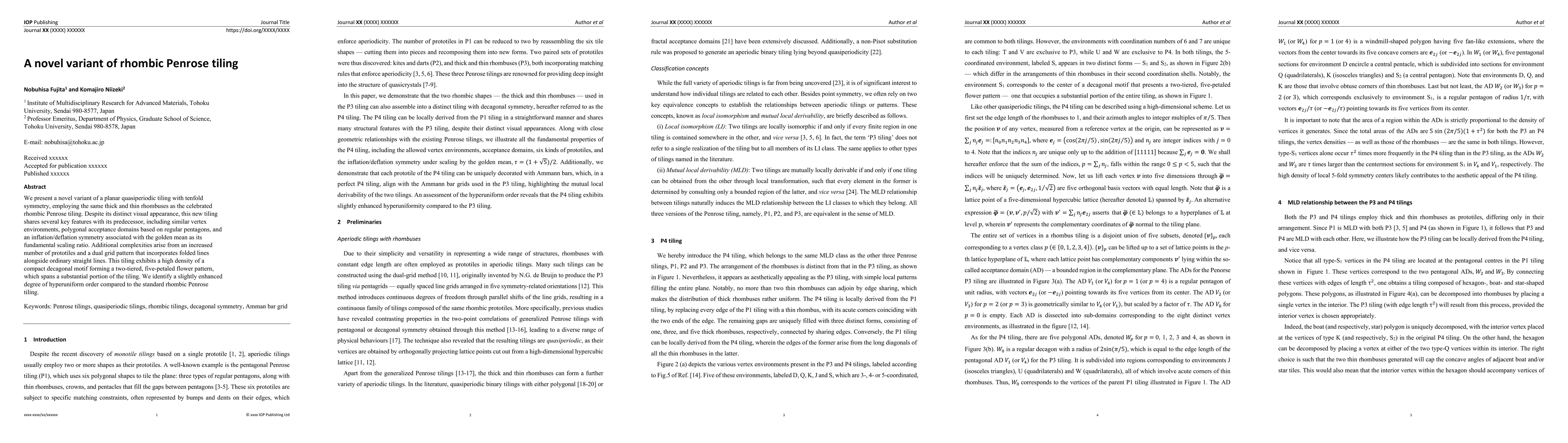 Researchers discover a new variant of rhombic Penrose tiling with increased complexity and hyperuniform order, featuring a high-density decagonal motif in a two-tiered flower pattern.