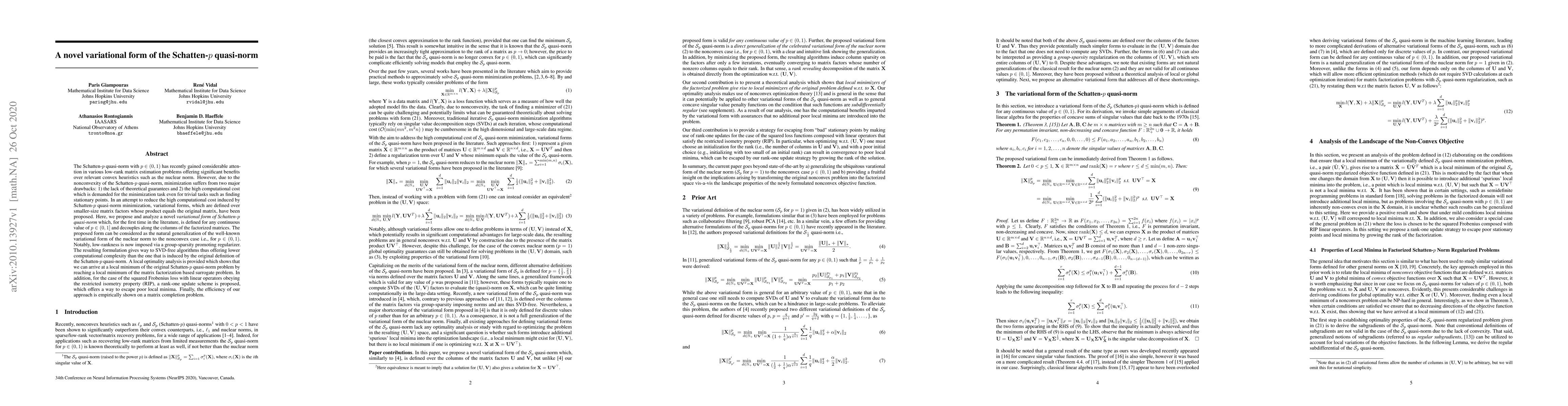 This paper proposes a novel variational form of the Schatten-$p$ quasi-norm for $p\in(0,1]$, which decouples along matrix factors and offers lower computational complexity than traditional methods. The approach provides theoretical guarantees for local optimality and introduces a rank-one update scheme to escape poor local minima, demonstrated effectively on a matrix completion task.