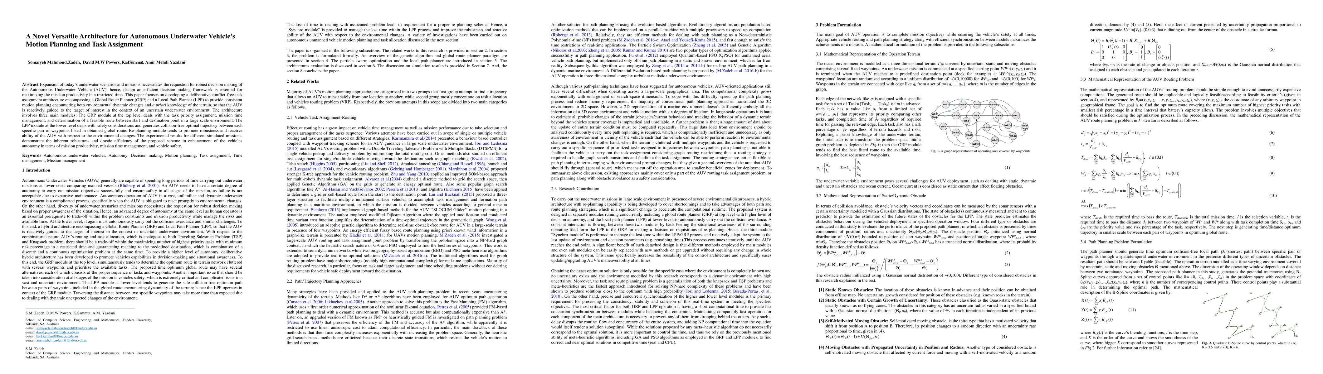 This paper proposes a novel architecture for autonomous underwater vehicle (AUV) motion planning and task assignment, featuring a Global Route Planner and a Local Path Planner for efficient decision-making and mission productivity. Experimental results show significant improvements in autonomy, mission time management, and safety in various simulated scenarios.
