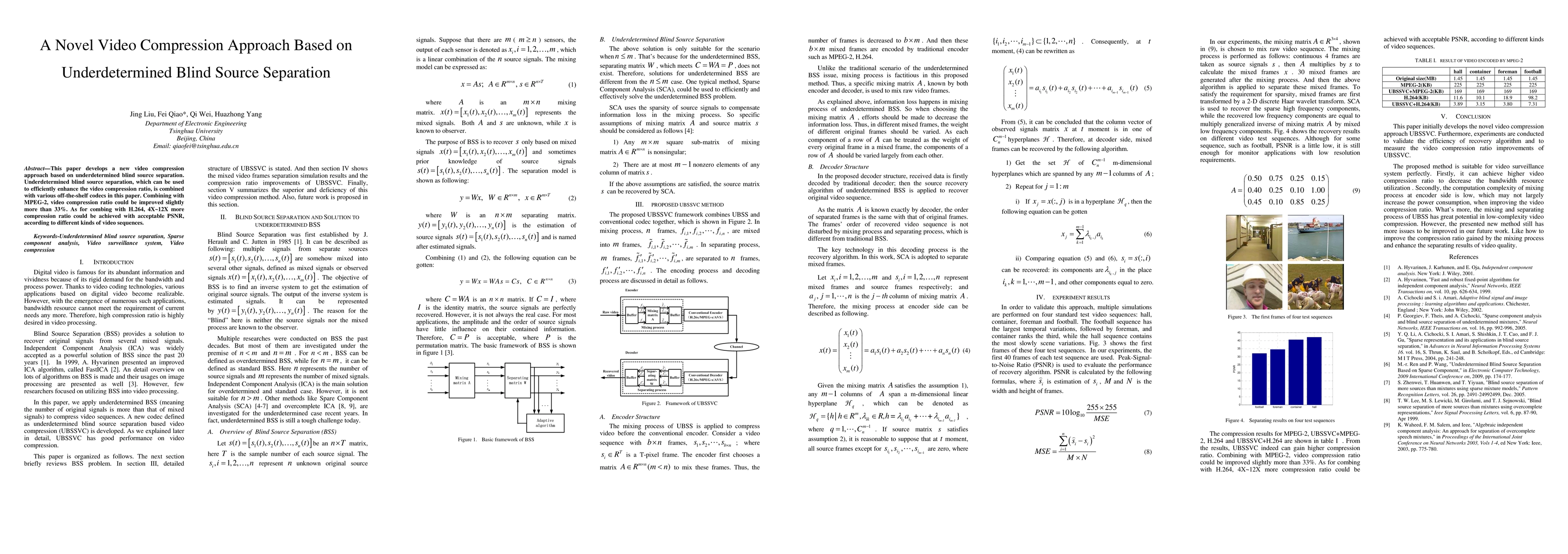 This paper introduces a novel video compression method using underdetermined blind source separation, achieving significant improvements in compression ratio when combined with MPEG-2 and H.264 codecs, with enhancements ranging from 33% to 12X while maintaining acceptable PSNR.