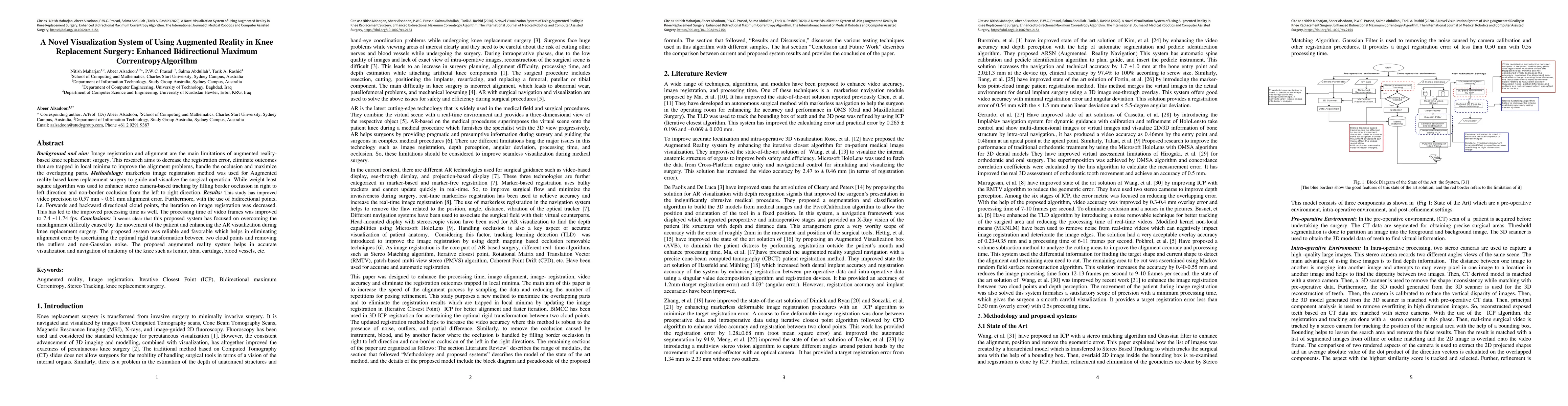 This research proposes an augmented reality system for knee replacement surgery using a novel visualization method and an enhanced bidirectional maximum correntropy algorithm to improve image registration and alignment, achieving a precision of 0.57 mm~0.61 mm and a processing speed of 7.4~11.74 fps, thus enhancing surgical accuracy and visualization.