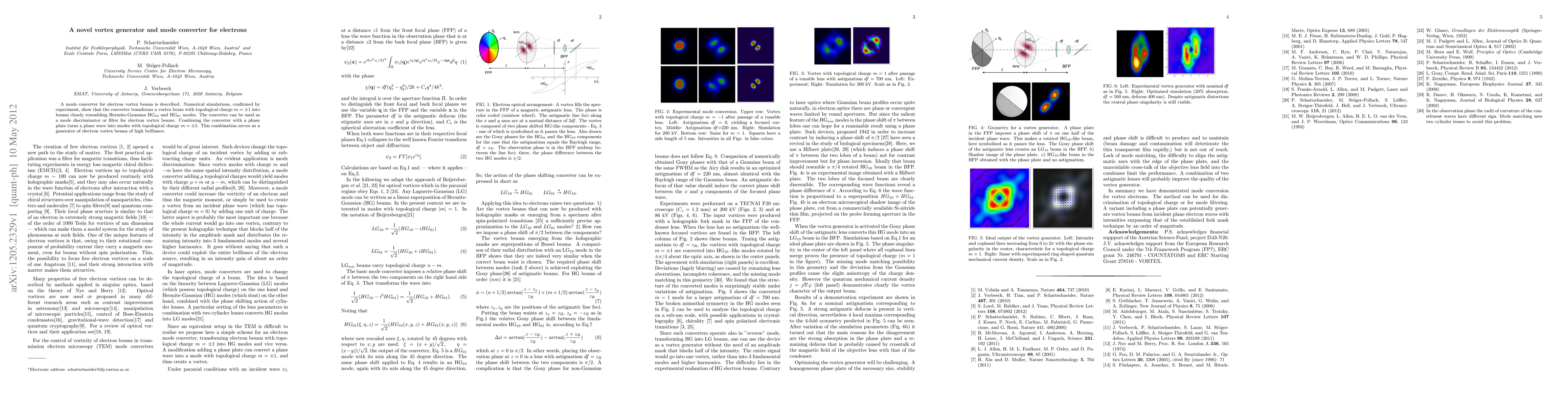 A mode converter for electron vortex beams is described. Numerical simulations, confirmed by experiment, show that the converter transforms a vortex beam with topological charge $m=\pm 1$ into beams closely resembling Hermite-Gaussian HG$_{10}$ and HG$_{01}$ modes. The converter can be used as a mode discriminator or filter for electron vortex beams. Combining the converter with a phase plate turns a plane wave into modes with topological charge $m=\pm 1$. This combination serves as a generator of electron vortex beams of high brilliance.