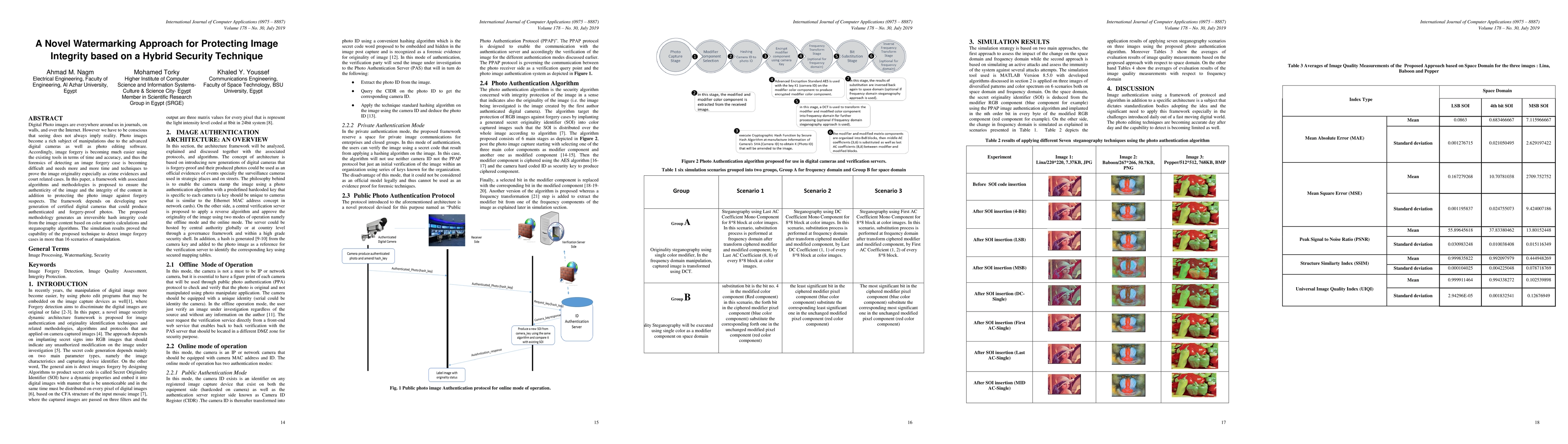 Digital Photo images are everywhere around us in journals, on walls, and over the Internet. However we have to be conscious that seeing does not always imply reality. Photo images become a rich subject of manipulations due to the advanced digital cameras as well as photo editing software. Accordingly, image forgery is becoming much easier using the existing tools in terms of time and accuracy, and thus the forensics of detecting an image forgery case is becoming difficult and needs more and more time and techniques to prove the image originality especially as crime evidences and court related cases. In this paper, a framework with associated algorithms and methodologies is proposed to ensure the authenticity of the image and the integrity of the content in addition to protecting the photo image against forgery suspects. The framework depends on developing new generation of certified digital cameras that could produce authenticated and forgery-proof photos. The proposed methodology generates an irreversible hash integrity code from the image content based on color matrix calculations and steganography algorithms. The simulation results proved the capability of the proposed technique to detect image forgery cases in more than 16 scenarios of manipulation.